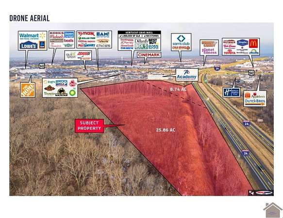 Prime 34.6 acre development opportunity in Paducah, KY, offering unmatched visibility and direct frontage along I-24. The property features approximately 2,300’ of I-24 frontage with +/-41,000 vehicles per day, creating a premier setting for large-scale commercial development. Designated as future commercial zoning, this property offers a wide range of development uses. A full boundary survey is underway, and all major utilities are available on site, allowing for a streamlined development process. Located near Exit 4, the property’s scale, interstate access, and infrastructure make it well-suited for distribution, logistics, warehouse operations, national retailers, or mixed-use and commercial residential projects. This highly visible inte