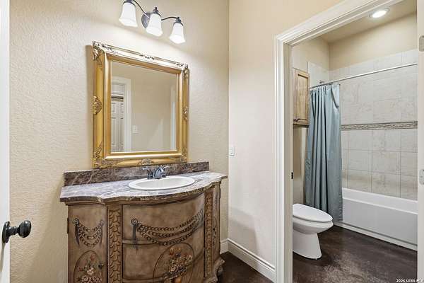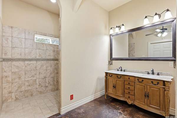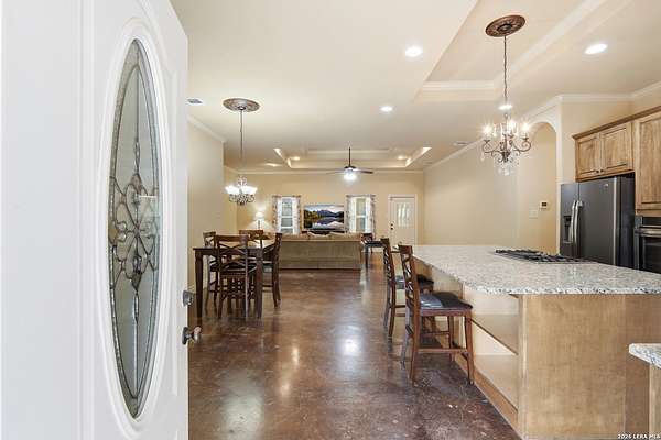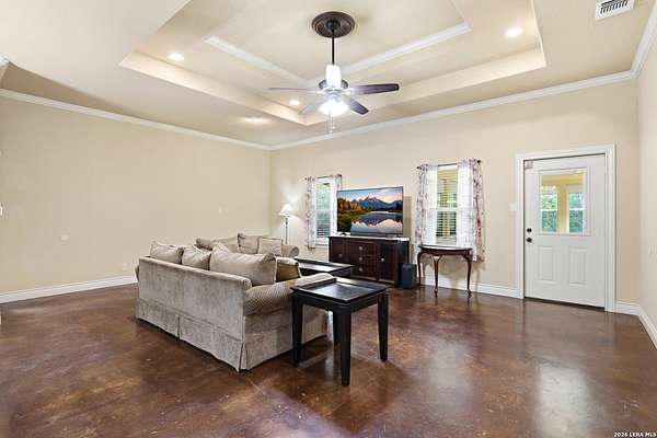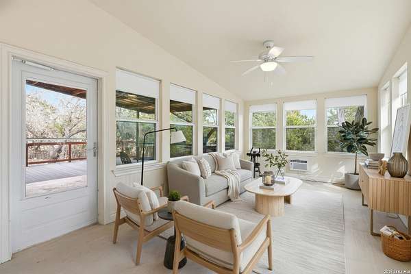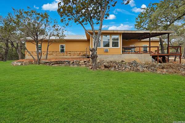 Situated on a quiet cul-de-sac in Spring Branch, this home offers privacy, versatility, and thoughtful design on a beautiful 2.22-acre fenced lot in the heart of the Texas Hill Country. This 2,832 square foot home is well suited for multigenerational living and enhanced accessibility. The main residence features 3 bedrooms and 2 full bathrooms, wide hallways, no carpet throughout, and a walk-in stall shower, providing ease of movement and low-maintenance living. An attached apartment / mother-in-law suite offers exceptional flexibility, complete with a fourth bedroom and private bathroom, kitchenette, and its own dedicated water heater and separate air conditioning system. The suite has private access through the oversized two-car garage or the back porch. An outdoor accessibility ramp provides convenient entry, while the oversized garage allows ample space for vehicles, storage, or workshop use. The fully fenced property offers added privacy and usability, with a seasonal creek along the back of the property, creating a peaceful natural backdrop and enhanced Hill Country charm. Located just minutes from Highway 281, Canyon Lake, Bulverde, and San Antonio, this property offers a rare combination of acreage, functionality, and serene surroundings.