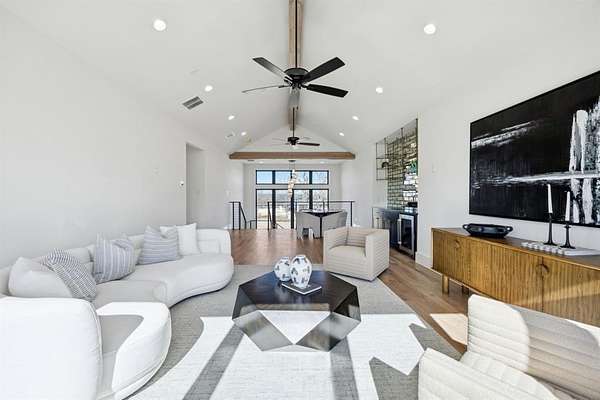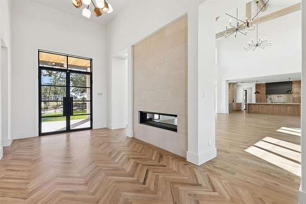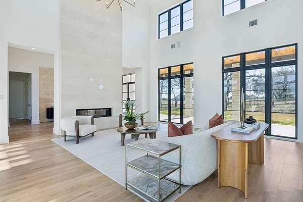 Experience refined living in the gated community of Santana Ridge Estates, located within the highly regarded Brock ISD. This exquisite 4-bedroom, 4 and a half bath home on a 2-acre lot blends modern elegance with country charm. A welcoming front courtyard porch leads into an open-concept floor plan centered around a double-sided fireplace and hand-scraped white oak hardwood flooring throughout. The gourmet kitchen features Taj Mahal and quartz countertops and a hidden catering kitchen, perfect for entertaining or meal prep. Extend your gatherings outdoors with a covered back porch and full outdoor kitchen. Each bedroom includes a private ensuite and walk in closet, offering comfort and privacy. The primary ensuite features a luxurious steam shower and designer finishes. A floating staircase with white oak threads ascends to the spacious game room and dedicated study. Throughout the home, you'll find porcelain and natural stone tile in wet areas for both beauty and durability. Smart home conveniences include a Josh Ai panel, integrated Lutron power shades, built-in speakers, and security cameras. A 4 car epoxied garage completes this thoughtfully designed residence. This property captures the perfect balance of modern luxury and relaxed country living in one of Brock's premier gated communities.