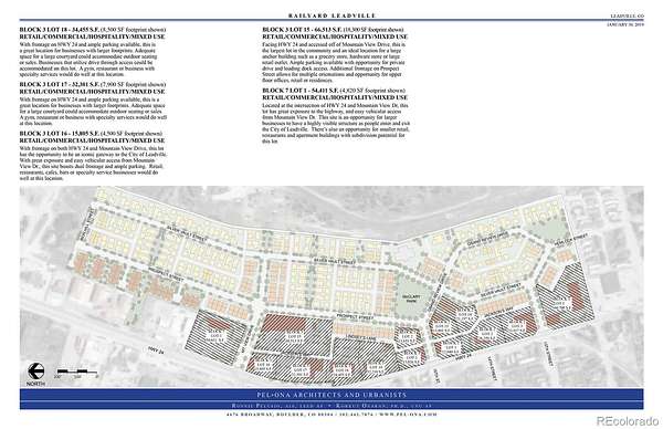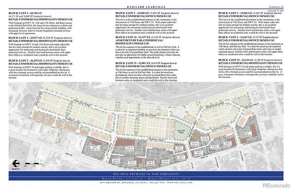 Block 2, Lot 3 – 23,917 sq. ft. (0.55 acres). With frontage on Hwy 24 and 13th Street, this is a great location for businesses looking to connect to the new Railyard Leadville neighborhood, as well as historic downtown Leadville! Plans show ample sidewalks that are large enough for outdoor seating, an excellent opportunity for a restaurant, retail shop and businesses that benefit from pedestrian activity. Multiple commercial, retail, mixed use, live-work possibilities in the new Railyard Leadville neighborhood! Please see www.RailyardLeadville.com for more information, photographs, and video. See other Railyard Leadville listings for additional Commercial Lots ranging in size from 12,040 sq. ft. to 66,513 sq. ft. Uses governed by the approved Planned Unit Development (PUD) and Final Plat. Commercial Lots subject to the Railyard Commercial Park Association. This listing is for the land only. Building footprints and supplements are provided for informational and illustrative purposes only.
