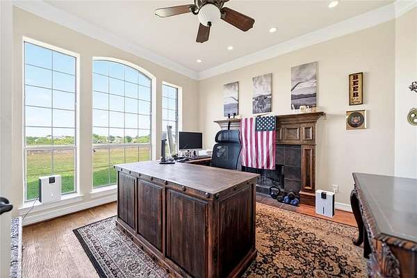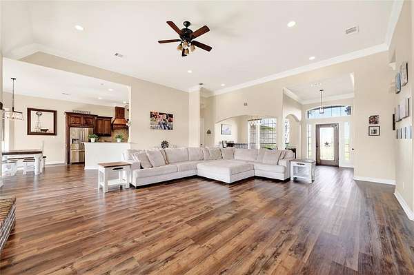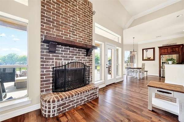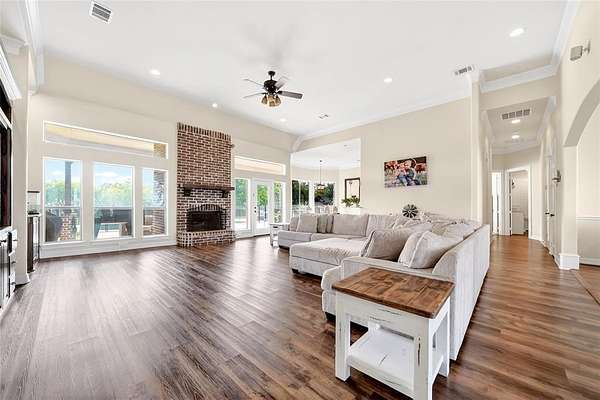 Designed with an open floorplan, the home flows effortlessly from space to space, making it ideal for both everyday living and entertaining. The expansive living area is perfect for game days or relaxing evenings, featuring a warm brick fireplace, rich wood accents, a custom built-in TV cabinet, and wood flooring that creates a welcoming, earthy feel.
