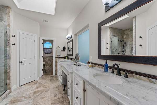 - Breakfast Bar, Built-In Features, Ceiling Fan(s), Chandelier, Double Vanity, Entrance Foyer, Granite Counters, Kitchen Island, No Interior Steps, Open Floorplan, Pantry, Primary Bedroom On Main, Recessed Lighting, Study/Home Office, Tray Ceiling(s), Walk-In Closet(s)