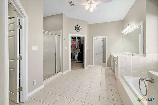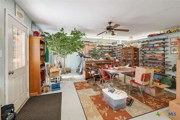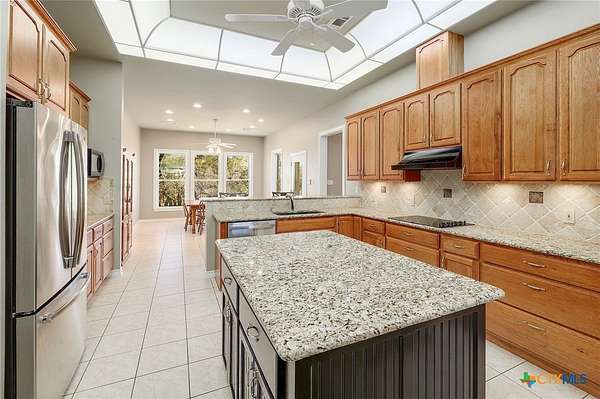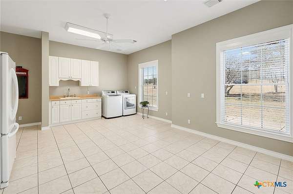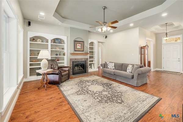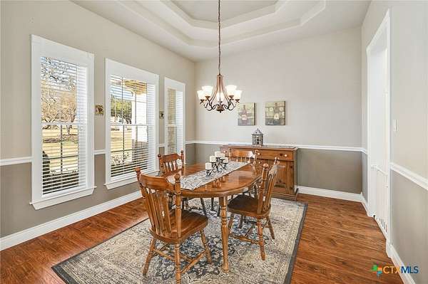 Beautiful Custom Home in the Texas Hill Country! This exquisite residence, situated in a serene gated community within the Texas Hill Country, features a spacious family room adorned with a cozy fireplace and expansive windows that showcase the stunning grounds. The elegant formal dining area, complete with chair rail, a beautiful trayed ceiling, and two-tone paint, is perfect for hosting large dinner gatherings. The generous kitchen provides ample storage, a central island, and includes a cozy dining nook. The spacious primary suite boasts an exquisite trayed ceiling and offers relaxing views of the surrounding property. The opulent primary bath includes a garden tub, a separate glass-enclosed shower, and two sizable walk-in closets. In addition to the three spacious bedrooms, a spacious study or office near the entryway is ideal for remote work. A large laundry room provides enough space for handling laundry, accommodating an extra refrigerator or freezer, serving as a hobby area, playroom, or even a comfortable spot for pets. On the property, you will also find a substantial 24 x 40 finished workshop with an 8 x 7 rollup door and a 23 x 24 finished work/hobby room. Additionally there is a 24 x 30 building with two 10 x 8 rollup doors to store your boat, mower or extra vehicles. Relax on the extended covered rear patio and embrace the tranquility of country living while enjoying the picturesque views of the property, enhanced by towering native oak trees.