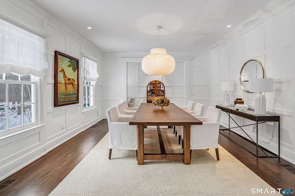 Located in the coveted Greenfield Hill neighborhood, this exceptional property offers the perfect blend of weekend retreat and everyday living, just 60 miles from Manhattan. Set on over 2 private acres with classic stone walls, cedar roof, copper gutters and professional landscaping, the home welcomes you with a dramatic two-story foyer and 9-foot ceilings throughout. The designer living room flows seamlessly into a gorgeous dining room with custom paneling and continues through a gallery-style hallway to the stunning gourmet kitchen, featuring Sub-Zero refrigeration, Wolf gas cooktop, wall oven, pantry, and high-end finishes. Just off the kitchen is a charming shiplap mudroom with direct access to the garage. The kitchen opens to a cozy family room accented with newly added wood beams and fireplace. French door sliders lead to the backyard, creating an effortless indoor-outdoor connection. The second floor features a serene primary suite with a spacious walk-in closet and a spa-like bathroom offering a double vanity and oversized shower and . Additional spacious bedrooms share an impressive oversized full bath, and a dedicated laundry room completes the level. The above-ground finished lower level provides flexible living space, ideal for a home gym or additional entertaining area. Outdoors, the property truly shines with a gunite pool surrounded by bluestone, above-ground boxed gardens, and a level lawn space perfect for entertaining, recreation, or quiet relaxation,