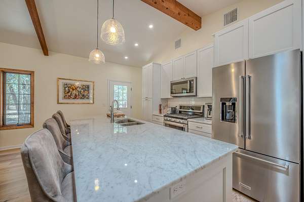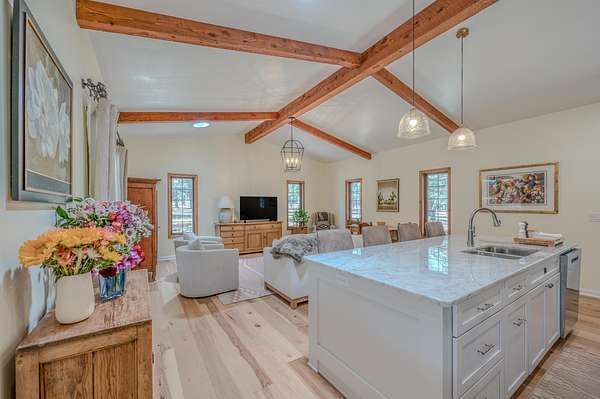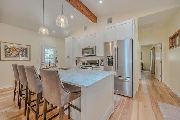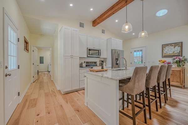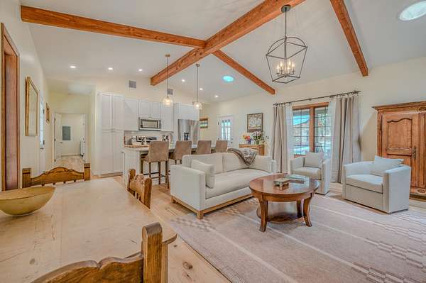The main home is over 3,400 square feet, with an attached two-car oversized garage featuring its own walk-in door entrance and exit, leading directly into the fenced backyard. With three bedrooms, two bathrooms, an oversized laundry area, an office, and a walk-in pantry, all situated within an open living space, this home flows seamlessly. The chefs kitchen accessorized with Wolf and Subzero appliances, with its beautiful island allowing plenty of space for food prep, is topped off by the gorgeous farmhouse-style sink. The front porch extends almost the length of the house and provides beautiful views of the Sapillo Creek valley. Main residence was completely remodeled in 2023 including new standing seam metal roof, new stucco, new bathrooms, kitchen, laundry room, flooring, and a new Generac generator installed in 2024.