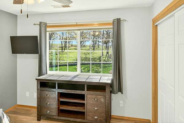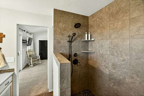 - Ceiling Fan(s), Granite Counters, Kitchen Island, Linen Closet, Open Floorplan, Primary Downstairs, Solid Surface Counters, Tile Shower, Vaulted Ceiling(s)