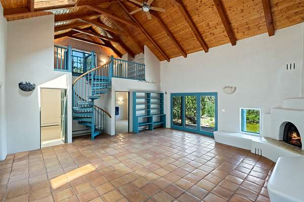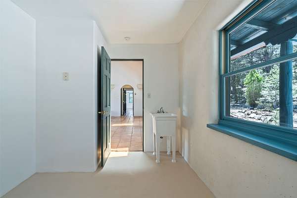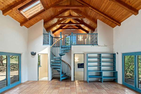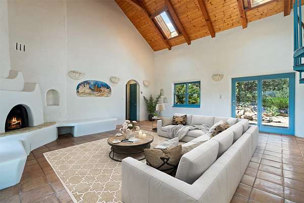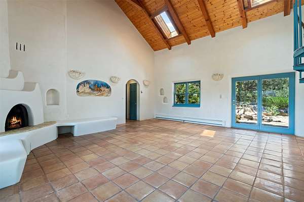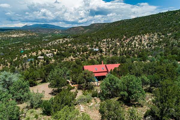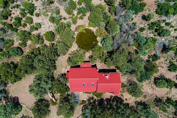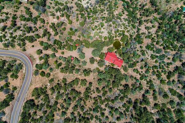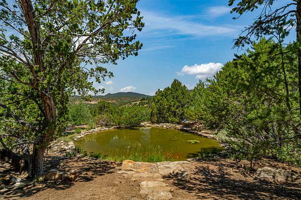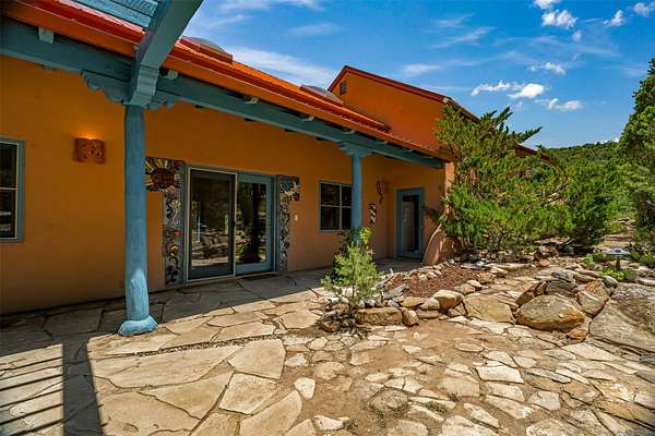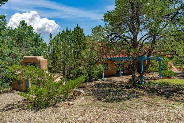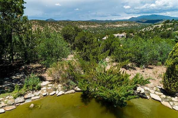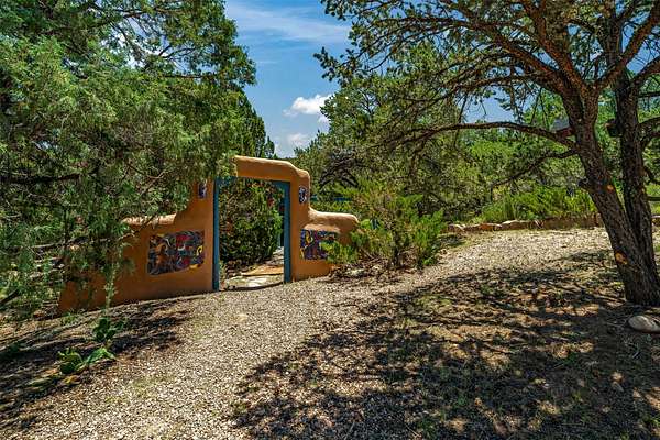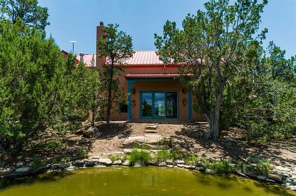 Nestled in the serene hills of Canoncito, this 3-bed, 2-bath Rastra home sits on 5.99 private wooded acres with a thriving koi pond, private well, and sweeping Sangre de Cristo views - offering a rare value-add opportunity. Owner-built and on the market for the first time since 1998, this home blends craftsmanship and artistic detail throughout. Soaring ceilings, a striking fireplace, and expansive windows define the main living space, while a lofted study/library offers a quiet retreat. The home was intentionally designed to be divided into two living areas, with pre-installed utility connections ready to support the setup. A workroom with slop sink, two storage sheds - including one with an electrical backup generator - add functionality. With a new septic system recently installed and an updated well system, this property offers a strong infrastructure base to build upon. Just 10 minutes to Eldorado and 25 to downtown Santa Fe, with nearby trails and 100 mbps internet available. A peaceful retreat and a rare chance to add real value.