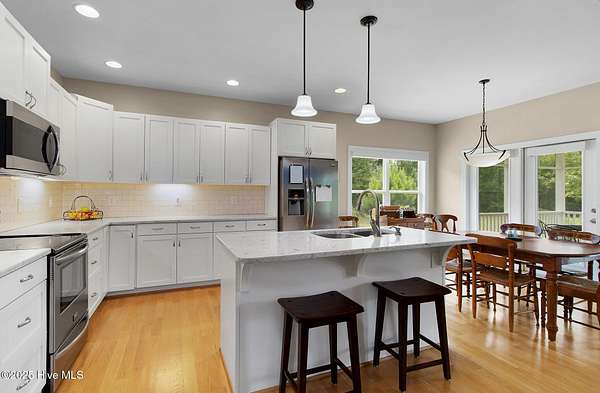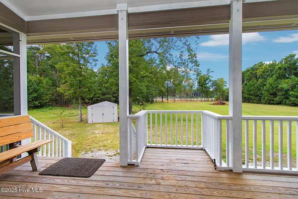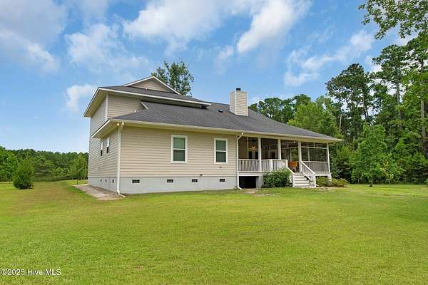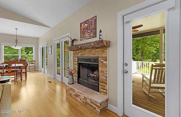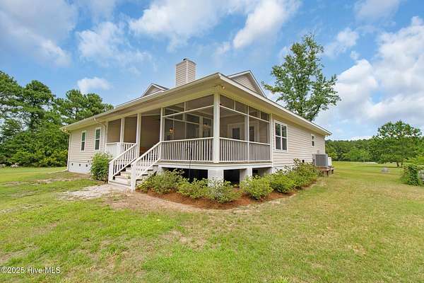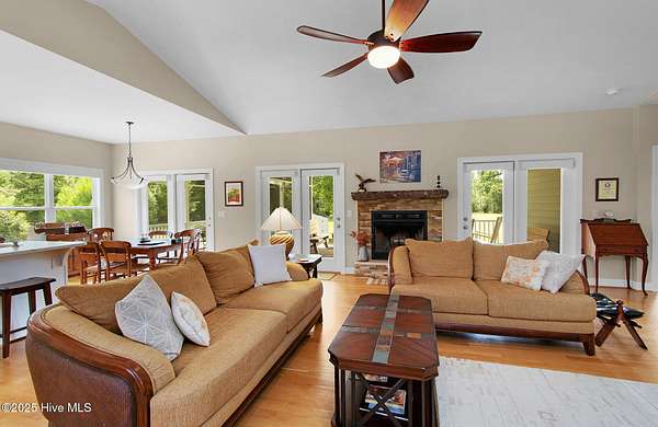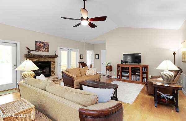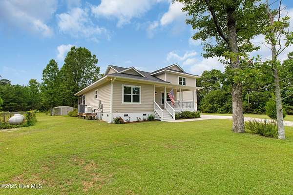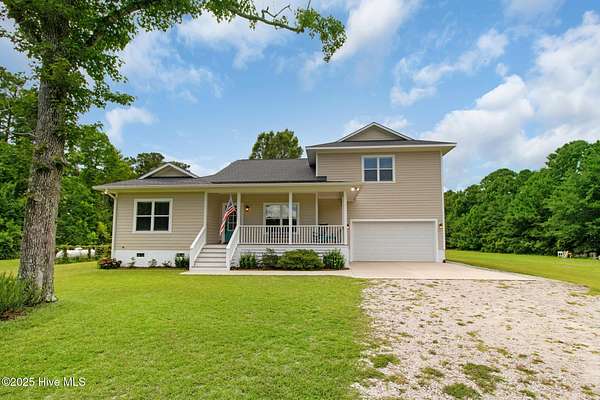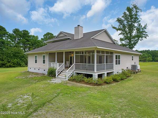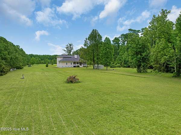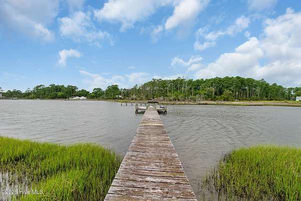 This waterfront, custom-built 3-bedroom, 3-bath home with a large bonus room sits on over 9 acres, offering both privacy and space to enjoy a quiet coastal retreat. A private dock provides water access, while wood floors flow throughout the open-concept first floor. The bright kitchen features white cabinets and countertops, a tile backsplash, stainless steel appliances, and a spacious island with extra seating that connects seamlessly to the dining area. Step from the dining space onto the screened porch-ideal for enjoying morning coffee or relaxing dinners outdoors. The living area, centered around a cozy wood-burning fireplace, opens to a covered porch with sweeping views of the expansive backyard. The spacious primary suite includes a walk-in closet and an ensuite bath with a double vanity and a tiled shower. Two guest bedrooms and a full bath are located at the front of the home, with a large bonus room and additional bath upstairs-perfect for a media room or office. A whole-house generator ensures comfort year-round, and a backyard shed offers convenient storage for lawn and outdoor equipment. This property was originally part of the Creekside subdivision; however, the restrictive covenants and recorded maps have been withdrawn from the Register of Deeds. There may be potential for subdivision, with expired septic permits for the remaining lots still on file at the Environmental Health Department. Buyer and/or Buyer's Agent should verify all information and conduct their due diligence. Whether you're looking to build, invest, or simply enjoy a peaceful, natural setting-this property offers endless possibilities.