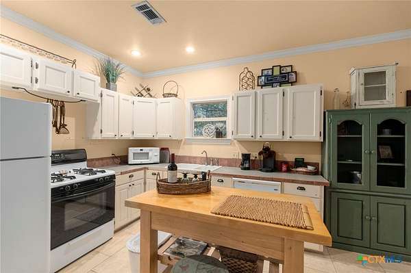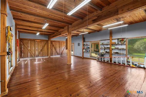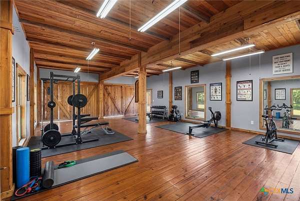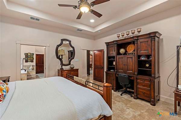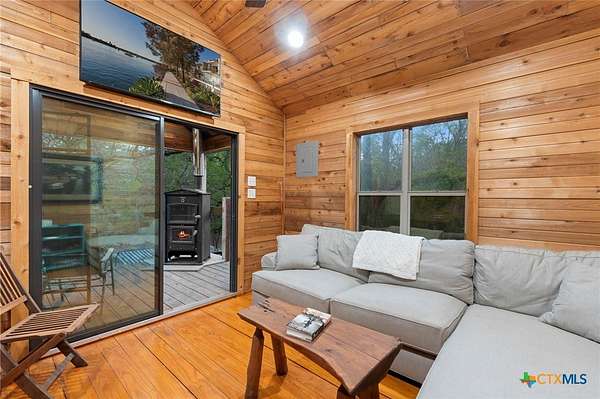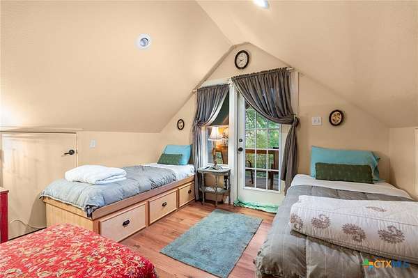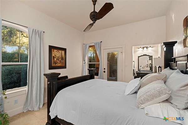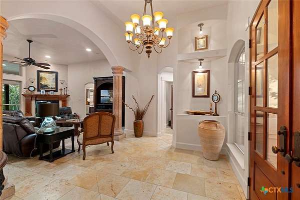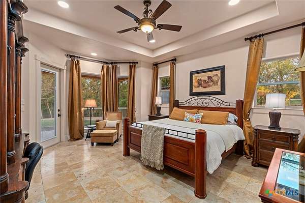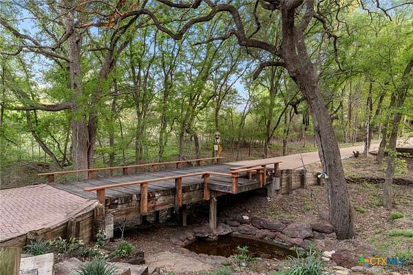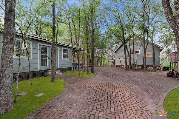 Mediterranean Inspired Riverfront Estate with Exceptional Grounds and Guest Accommodations Set on approximately 2.84 acres with direct San Marcos River frontage, this distinctive estate offers a rare combination of architectural character, expansive outdoor living, and guest accommodations. Thoughtfully designed, the property provides a private setting enhanced by natural surroundings. The main residence is a Mediterranean-style stucco home featuring three bedrooms and two and a half bathrooms with travertine flooring throughout. The kitchen includes a marble island and custom cabinetry. Two secondary bedrooms open to a private courtyard for seamless indoor-outdoor living. The primary suite offers a spacious retreat with a two-story closet, jetted tub with heating system, and reinforced safe room. Outdoor living includes a covered patio with fireplace, TV space, full outdoor kitchen, and fire pit. Additional features include a whole-home generator, leafguard gutters, and a two-car garage with extendable awning. The property also features a four-car garage with tongue and groove flooring, plumbing, and outdoor shower, plus an additional two to three car garage or workshop. A separate one-bedroom guesthouse with full kitchen and private balcony provides comfortable accommodations. A standout feature is the elevated treehouse retreat overlooking the river, designed as an efficiency with kitchenette, living area, outdoor shower, and deck with wood-burning pizza oven and fireplace. The grounds include approximately 18,000 square feet of brick pavers leading from the gated entrance to a riverfront deck, along with covered picnic areas and gathering spaces. Additional highlights include a water feature beneath a bridge, riverside sitting, and full RV hookup. Combining river frontage, architectural detail, and extensive amenities, this property offers a unique opportunity for private enjoyment, entertaining, or flexible living in a scenic Texas setting.