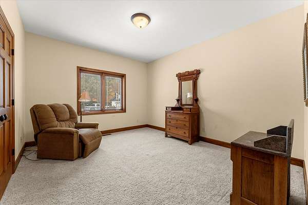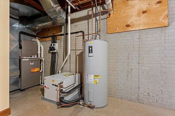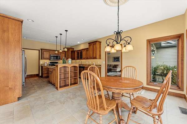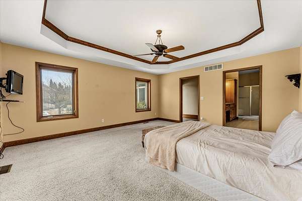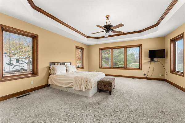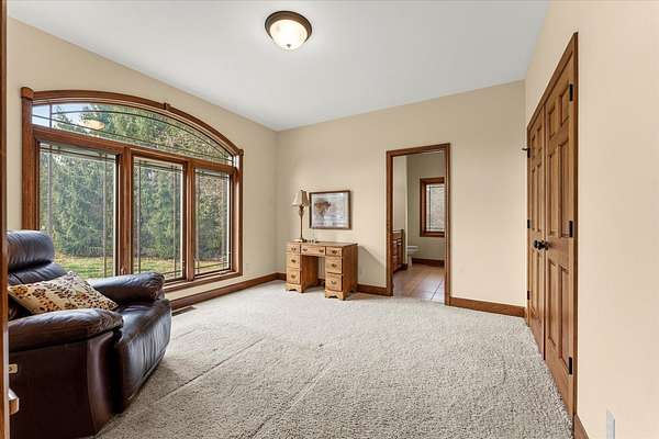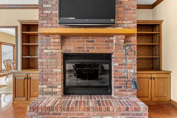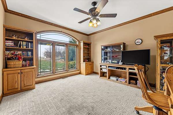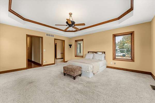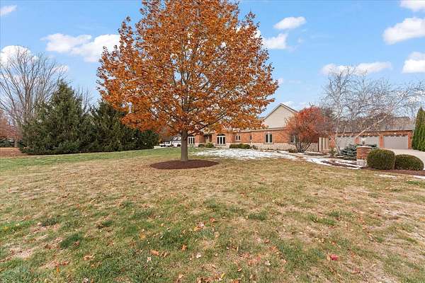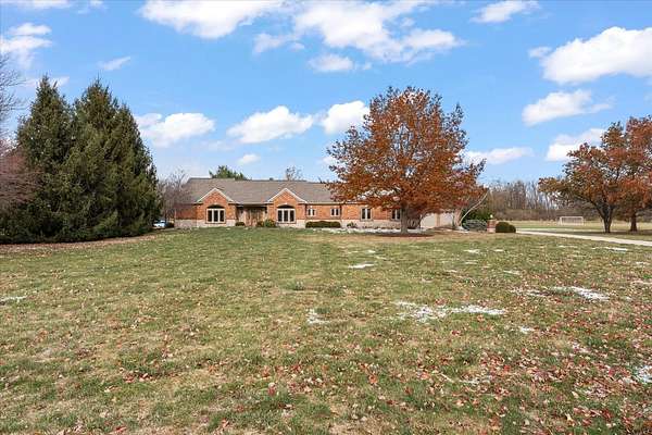 Welcome to this spacious 3-bedroom, 3.5-bathroom brick ranch offering comfort, functionality, and timeless style. Located on a huge 2 acre lot! A large entryway leads into the inviting living room featuring a beautiful brick fireplace with built-in surrounds, seamlessly connecting to the bright eat-in kitchen with ample countertop space and abundant natural light. The formal dining room, accented by elegant tray ceilings, provides the perfect setting for gatherings. A generous laundry room offers additional convenience with countertop workspace, storage, and a utility sink. The primary suite features tray ceilings, a walk-in closet with a custom organization system, and an en suite bath complete with double sinks, a built-in makeup vanity, a soaking tub, and a separate shower. A spacious office, two additional bedrooms, a half bath, and a full bath complete the main level. The unfinished basement includes a full bathroom and offers endless possibilities for expansion or recreation. New roof 2 years ago. Geothermal system.