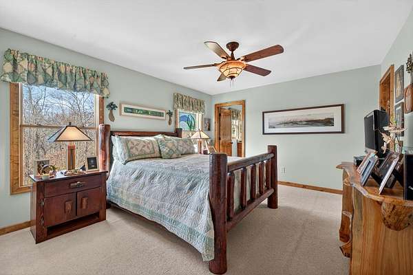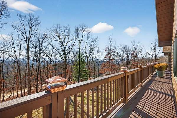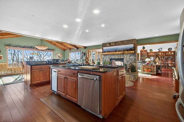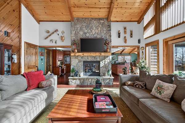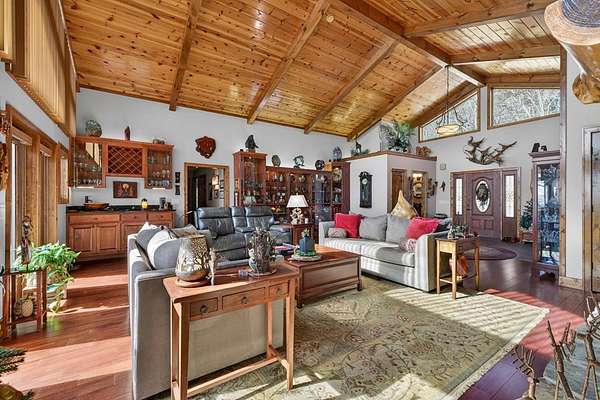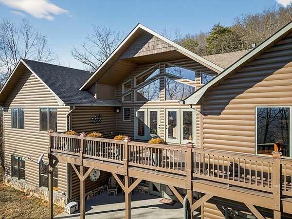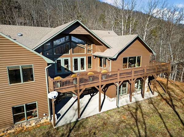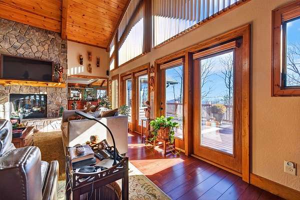 FULLY FURNISHED mountain home with Rustic Charm and Elegance. This stunning custom built home was designed with thoughtful details inside and out! The amazing family room boasts a beautiful vaulted wood ceiling and rosewood-stained Brazilian mahogany floors, custom built-in cabinetry, wet-bar with wine rack, and magnificent stone see-through fireplace. The dream kitchen showcases granite countertops and an abundance of cabinets and built-in shelving, coffee bar, desk, prep sink, double ovens, two large islands, a bright and relaxing breakfast room and phenomenal walk-in pantry. The oversized mudroom includes more cabinetry and storage, front-load washer/dryer and tile animal bathing station. Main floor features a master en suite with huge designer closet, a spacious guest bedroom with bath and office, 1/2 bath and 3rd bonus room. Finished basement includes a 2nd kitchen, family room, game room, 2 spacious storage rooms, 2 bedrooms, full bath and large outside covered patio. The beautiful exterior has newly painted log siding, large covered porch with wrap around deck, open decks with new Trex boarding, a fabulous screened porch with gas line grill hookup and a pretty breezeway leading from the porch to the large 3 car garage. The home has a beautiful, peaceful setting with lovely seasonal views. The nicely landscaped lot is spacious and gentle with room for gardening. Also included with the home is a whole house generator, whole house central VAC system, alarm system and custom-built furniture. Wall decor not included. MOTIVATED SELLER.