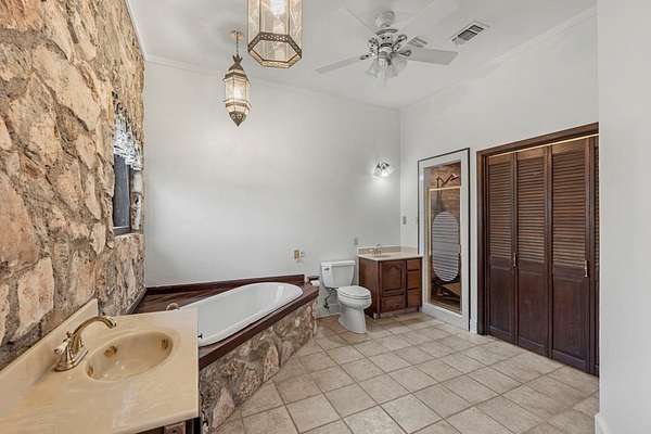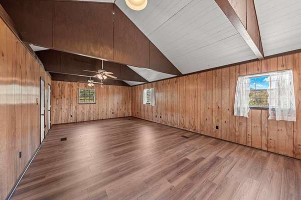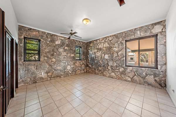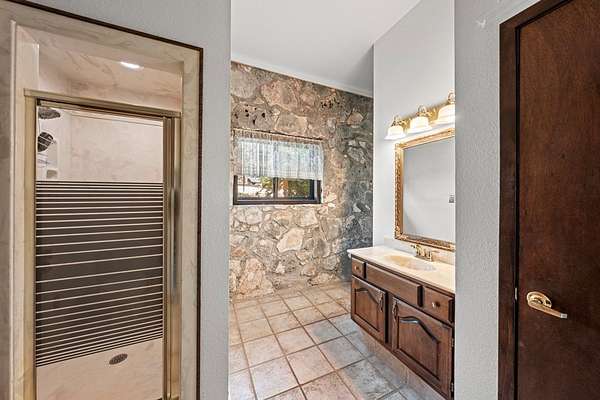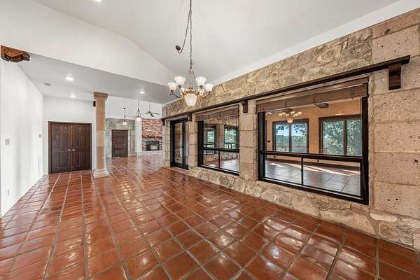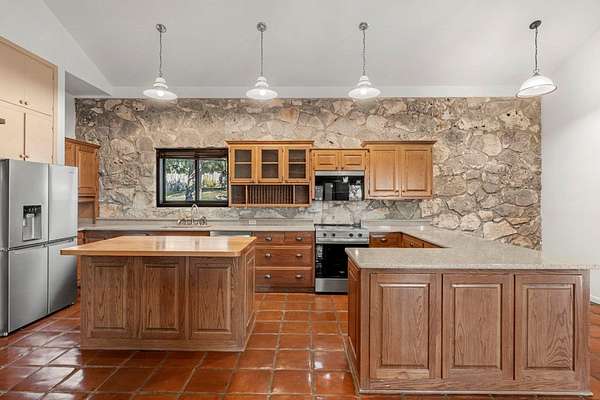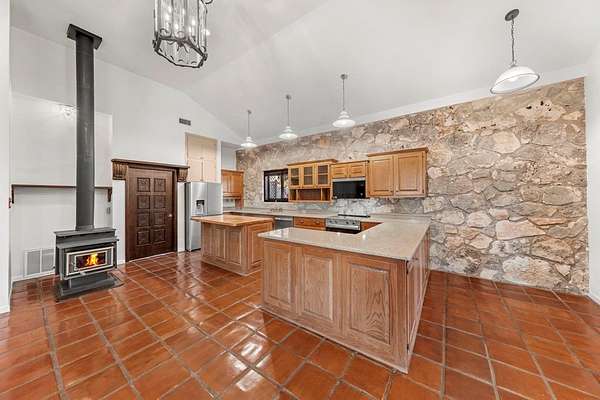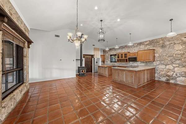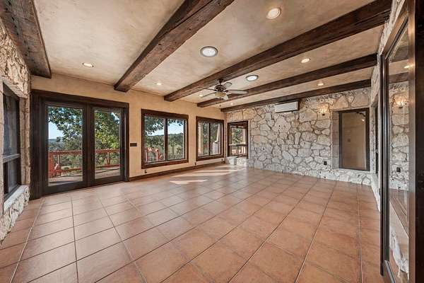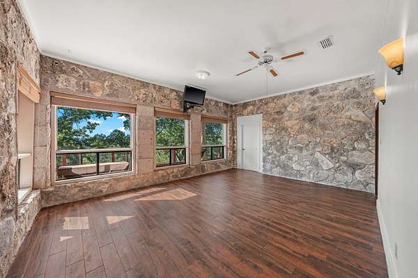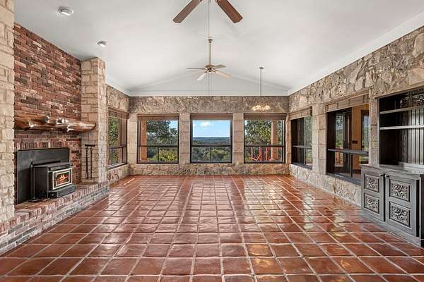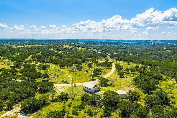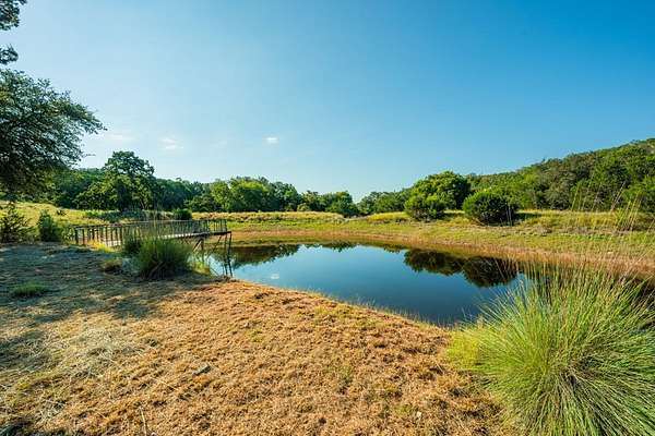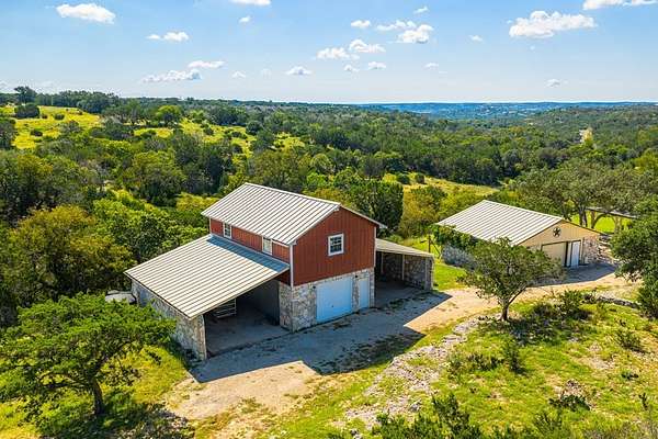 Multiple-home property with a total of 4 bedrooms, 4.5 baths, and three full kitchens combined, making this a wonderful recreational ranch, large family homestead, or business venture. Set on 91 acres just 10 minutes from downtown Kerrville, this AG-exempt property features abundant Axis and Whitetail deer, a large fishing pond with dock, mature trees, and panoramic Hill Country views. The main limestone and stucco home offers Saltillo tile floors, high ceilings, two spacious primary suites, an open kitchen with new appliances, and a grand living area with stone fireplace. Additional dwellings include a detached rock guesthouse and an upstairs apartment. Large RV barn (approx. 3,000 sq. ft.), workshops, and multiple barns complete the property. Peaceful, private, and unrestricted-ideal as a corporate retreat, wedding venue, or short-term rental.
