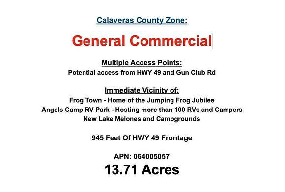 Prime Opportunity: 13.71 Acres with Endless Potential! This incredible 13.71-acre parcel, zoned C2, is the ultimate blank canvas with almost 1,000 feet of HWY 49 frontage! The real question isn't What can you do here? it's What can't you do? Situated right next to Calaveras County's iconic Frog Jump Fairgrounds, home to the World-Famous Jumping Frog Jubilee and the popular Angels Camp RV Park, featuring over 100 spaces and countless visitors, this property enjoys an enviable location with unmatched exposure. With HWY 4 frontage you'll command the attention of every traveler between Angels Camp, Sonora, and Yosemite. Bonus perks? A well on the property that produced an impressive 100 GPM when drilled (buyer to verify current output). Stop dreaming and start building. Whether you're envisioning a commercial masterpiece, or a hospitality hub, this rare gem in Calaveras County is your opportunity to make it happen. The possibilities are endless let your imagination take the lead!