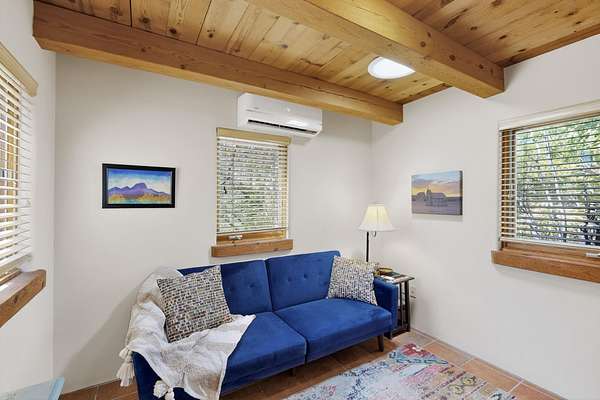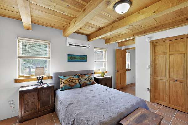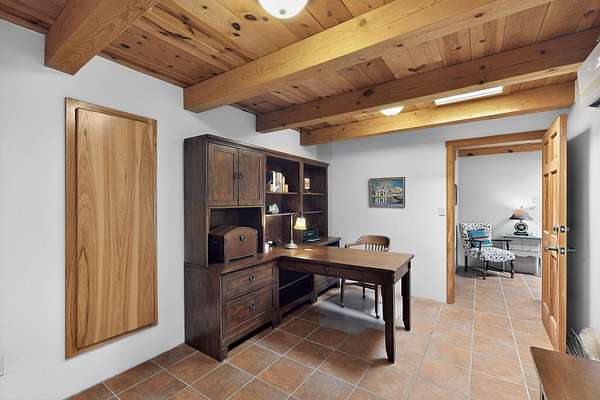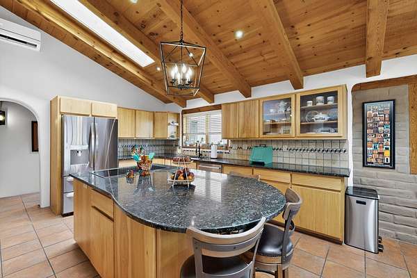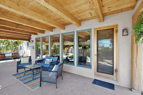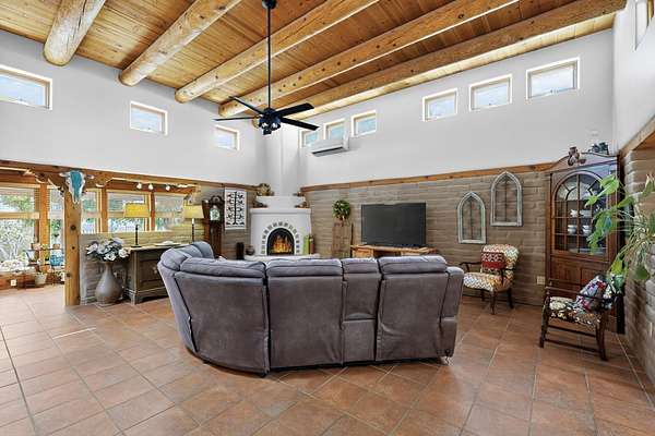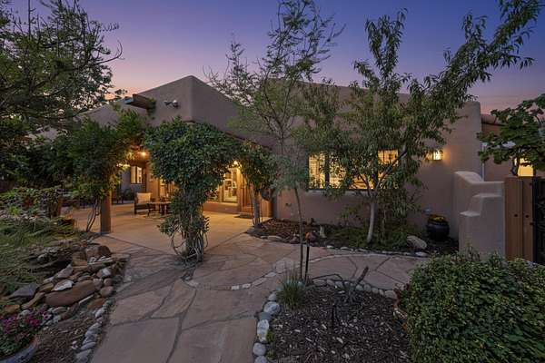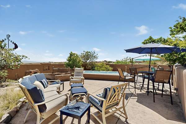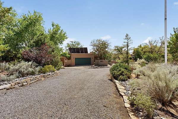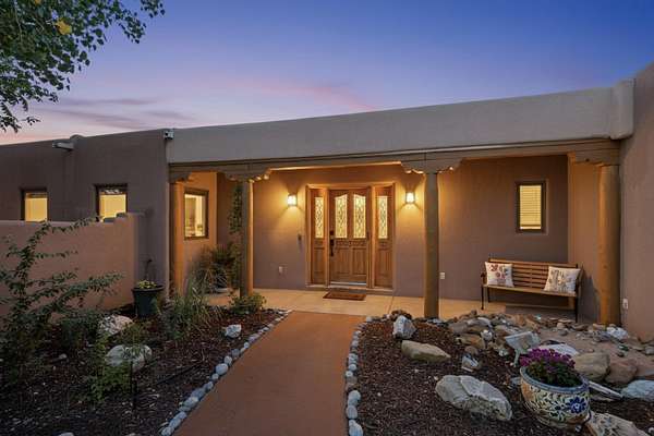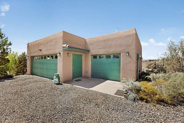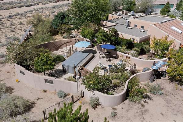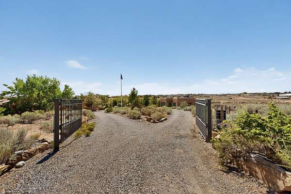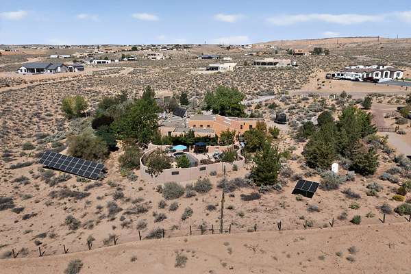 WELCOME HOME!!! Experience breathtaking Sandia Mountain views from this 7.0-acre pueblo-style retreat on a private cul-de-sac in Rio Rancho. Zoned E-1, perfect for horses, this property offers both privacy and convenience. Enter through a hand-carved gate to a lush courtyard and covered patio. Inside, discover viga ceiling beams, adobe brick foyer, kiva fireplace, and a sun-filled solarium--ideal for an office or garden room. Gourmet kitchen boasts custom cabinets, marble counters, island, and stainless appliances. Owner's suite features a solarium sitting room and spa-like bath. Attached casita with 2 bedrooms, bath, and sitting room. Outdoors: gardens, water features, hot tub, Swim spa pool, two 3 car garages, and owned solar.
