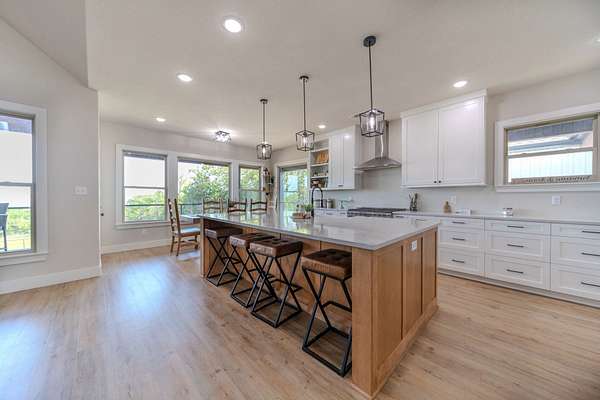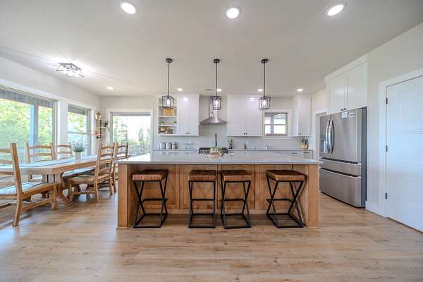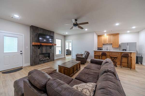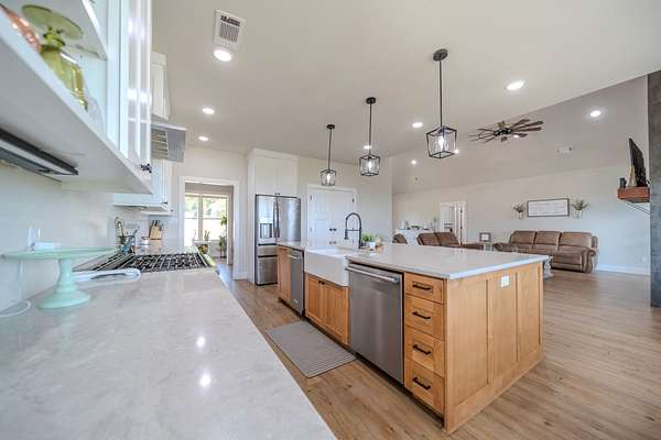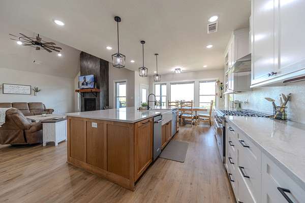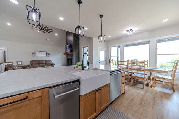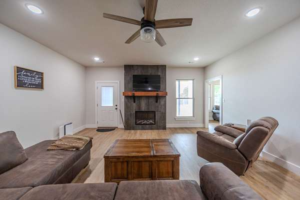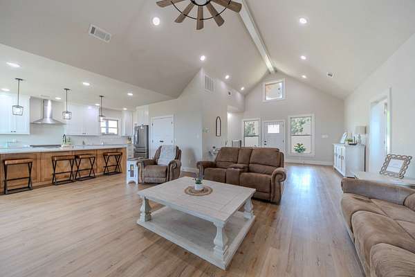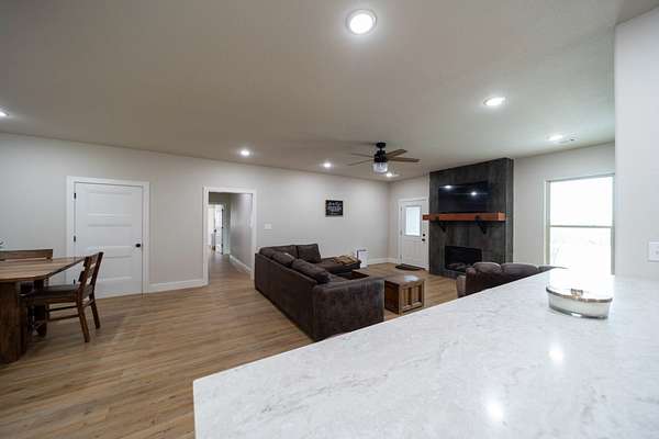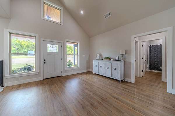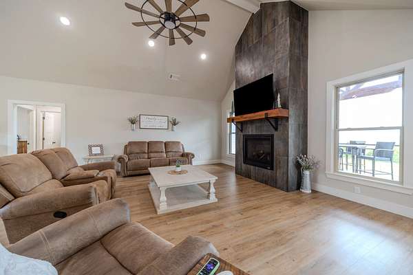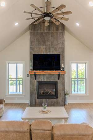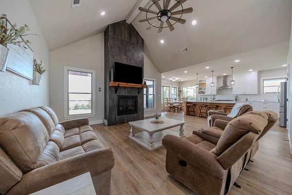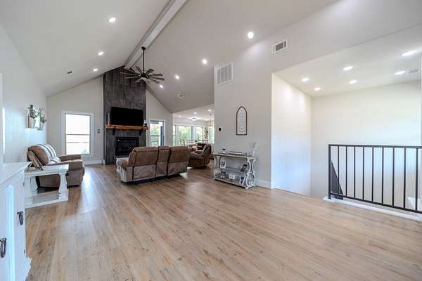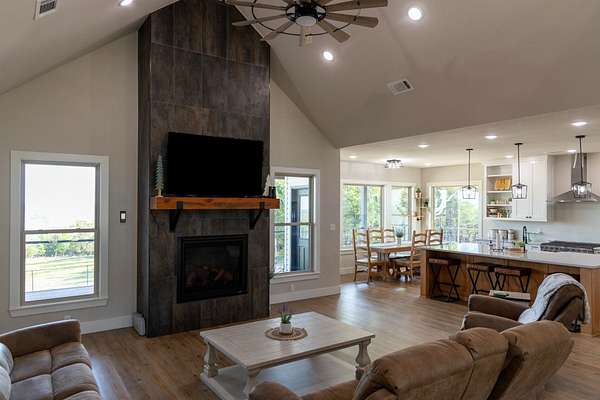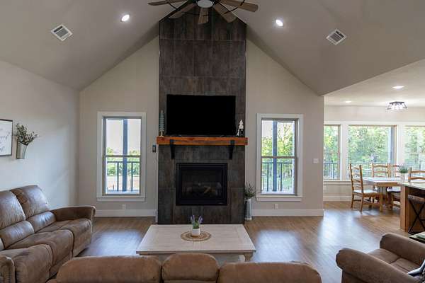 A Dramatic Welcome: Upon crossing the threshold, you are greeted by soaring cathedral ceilings and the warmth of a grand propane fireplace that serves as the heart of the home. The rooms are floored with beautiful custom vinyl plank flooring.