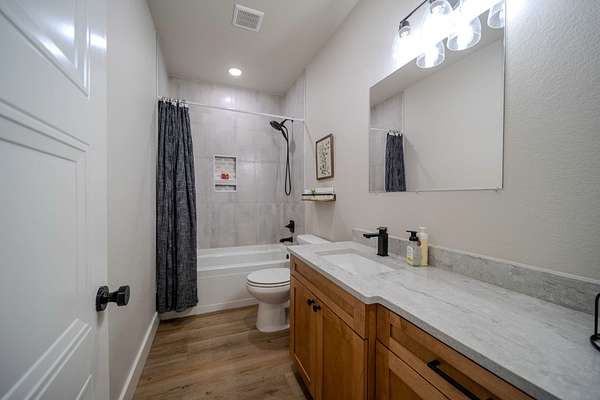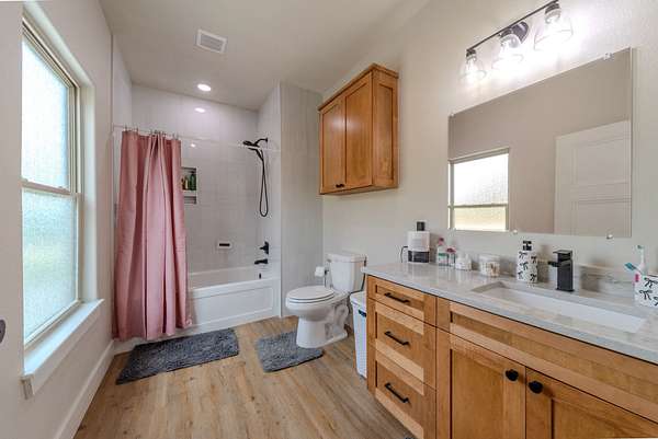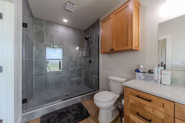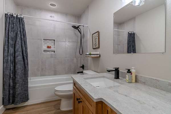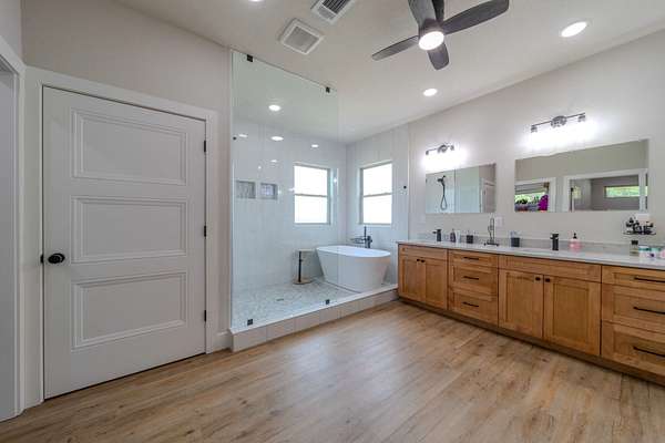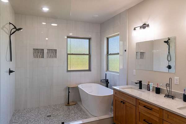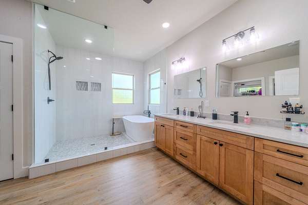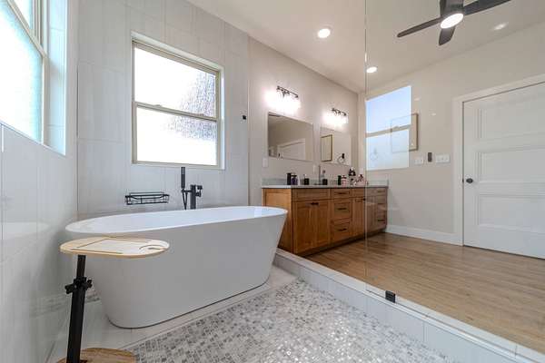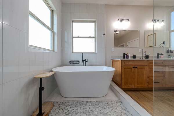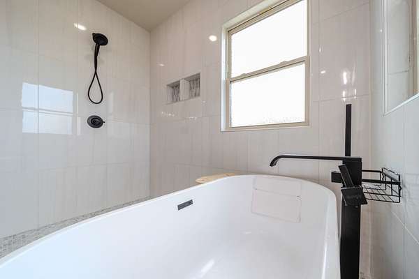The Primary Sanctuary: The main-level master suite is a masterstroke of design, offering a spa-like retreat with a luxurious soaking tub combined with a custom-tiled walk-in shower, and a massive closet that flows directly into the adjacent private laundry room.