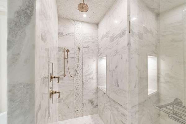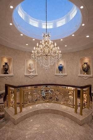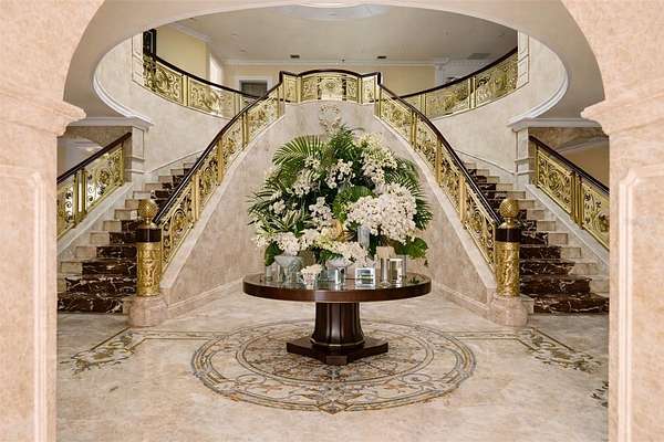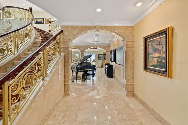 Marble-encased archways and columns, intricate gold balustrades, and detailed ceilings create a striking architectural presence, while illuminated art niches enhance the home’s scale and design continuity.