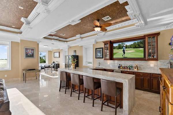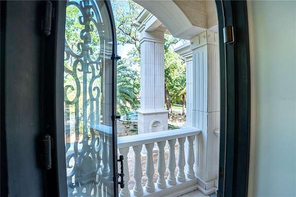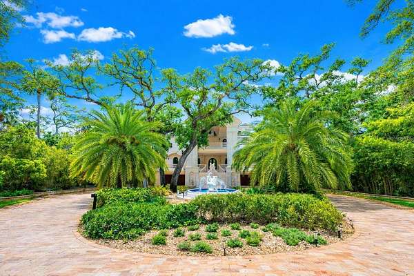 A grand motor court and porte-cochère create a secure, estate-style arrival. The limestone exterior, curated from Portugal, along with wrought iron detailing, a distinctive blue dome, fountain, marble statuary, and mature oak trees, establishes a timeless setting surrounded by lush tropical landscaping and the neighborhood’s iconic peacocks.