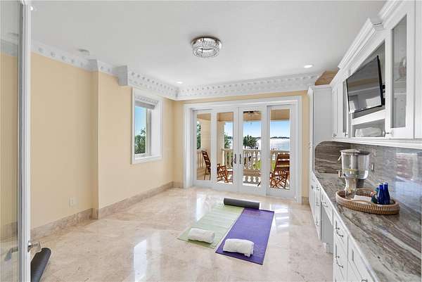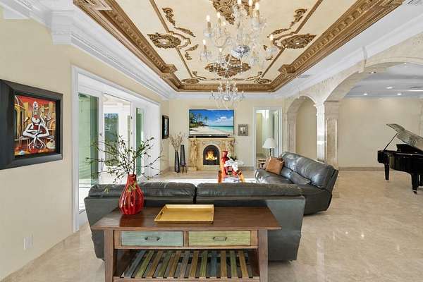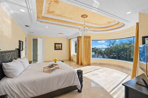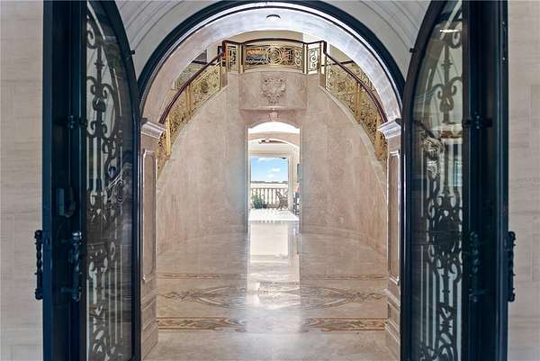 Inside, a dramatic domed rotunda crowned by a statement crystal chandelier anchors the home, featuring inlaid marble flooring and dual sweeping marble staircases. The layout captures water views throughout, with a gallery-style corridor ideal for art, a grand piano, or entertaining.