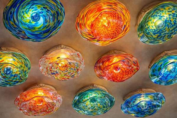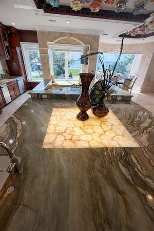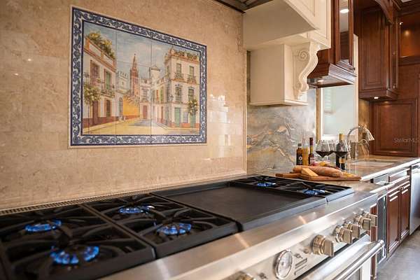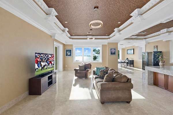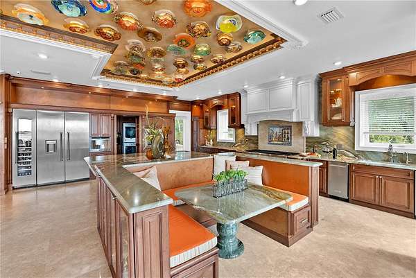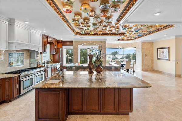 Custom millwork, fresco-style ceilings, and imported marble flooring span all three levels. The kitchen features a full suite of Thermador appliances, including a 60-inch gas range, integrated refrigeration, and built-in coffee system, along with quartzite surfaces and an illuminated onyx island. A custom Chihuly-style installation of hand-blown glass creates a dramatic, one-of-a-kind focal point above, while the curved glass dining area frames panoramic water and pool views, with expansive space to accommodate large-scale dining, multiple seating arrangements, or extended entertaining areas.