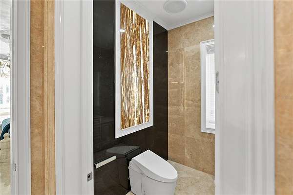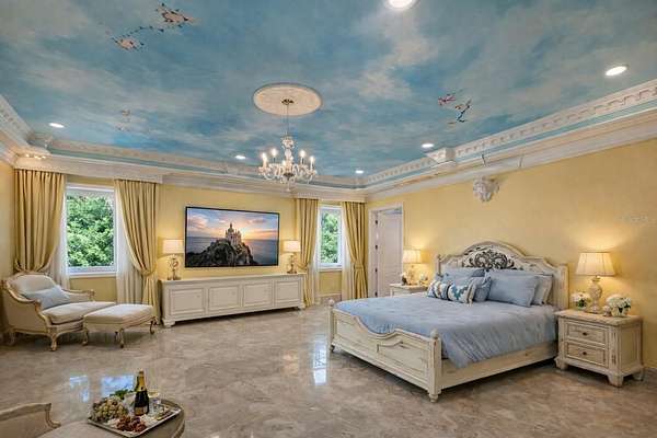 The main-level primary suite offers a marble bath with Phylrich fixtures, sauna, soaking tub, multiple vanities, private lanais, and panoramic water views beneath a custom fresco ceiling.