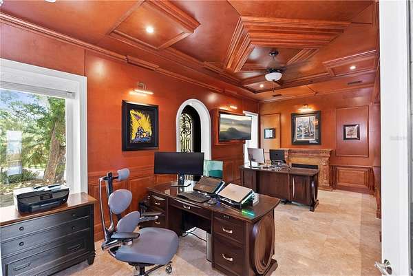 A private office on the main level features paneled walls, built-ins, an ornate stone fireplace, and balcony access. The upper level includes a club-style lounge with a waterfall quartzite bar and sunset views. The home spans three levels with elevator access and marble staircases. Laundry rooms on multiple levels add everyday functionality.