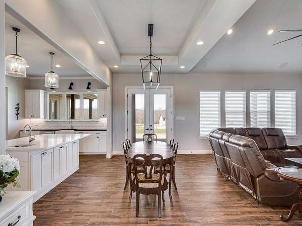 Starry skies and breathtaking sunsets await at this custom built retreat on 2 acres in the prestigious estates of Newsom Ranch. Designed for both everyday comfort and unforgettable entertaining, this home offers refined finishes, thoughtful upgrades, and stunning views from every angle. Impressive double entry doors welcome you with an abundance of natural light. Elegant ceramic tile flooring flows seamlessly into the expansive living and dining areas. A striking gas fireplace with custom mantle serves as the focal point, while vaulted ceilings accented with a wood beam create warmth and architectural charm. The Chef's Kitchen is truly exceptional, featuring a six-burner cooktop, double ovens, and oversized island with prep sink and bar seating. A walk in butler's pantry with custom cabinetry and hidden microwave adds style and function. Leather-finished granite, custom backsplash, beautiful pendant lighting, and a farmhouse sink framed by windows overlooking the acreage elevate the space even further. The spacious primary suite is a private sanctuary with patio access for peaceful evenings under the stars. The luxurious en suite bath features double vanities, freestanding soaking tub, and a walk-in shower. Split bedrooms provide privacy for all, and the fourth bedroom, complete with en suite bath, makes an ideal guest suite, craft room, or mother-in-law retreat. Working from home is effortless with both an AV office and an additional library office, offering multiple workspaces. Even the laundry room impresses with custom cabinetry, utility sink, brick tile flooring and direct access to the primary closet. A Bonus Feature is the 20x30 Insulated Workshop with 10x10 roll-up door, mini-split climate control, and ample 110 and 220 electrical service, perfect for hobbies, projects, or additional storage. Enjoy morning coffee on the extended covered front porch or unwind on the back patio, taking in the panoramic views. This is the Dream Retreat you've been waiting for!