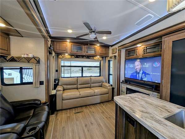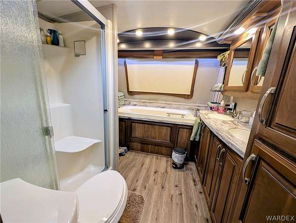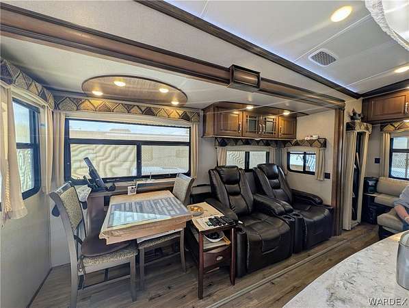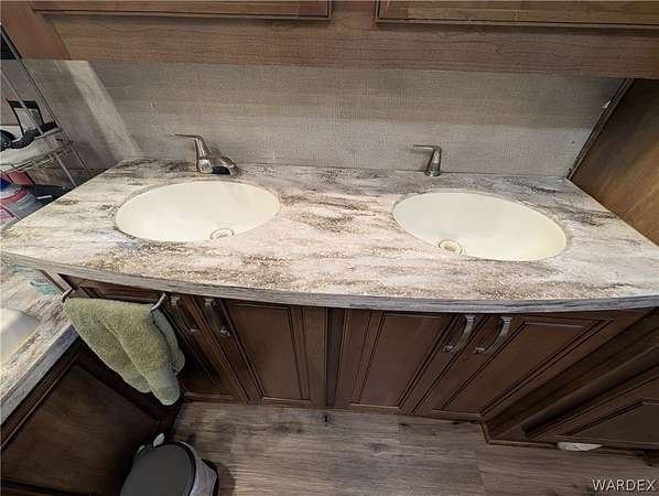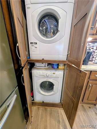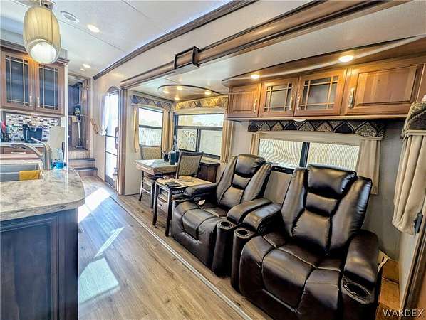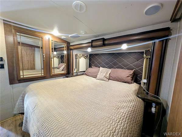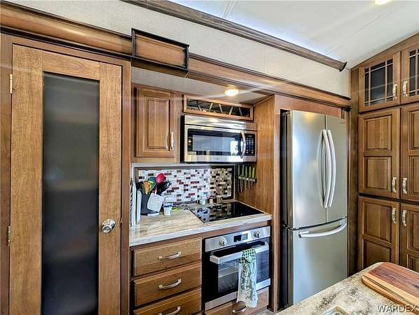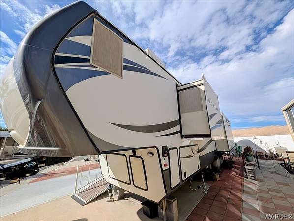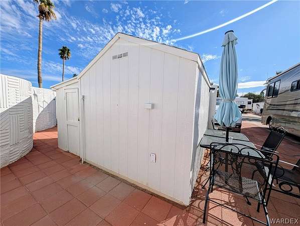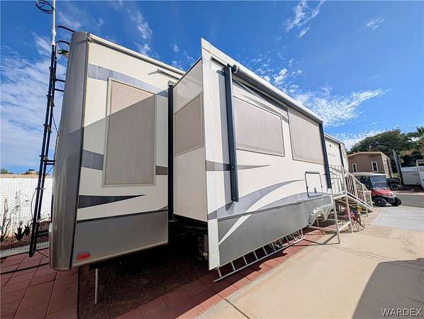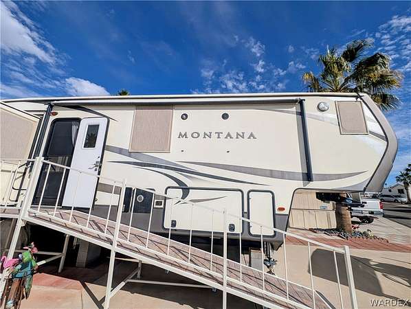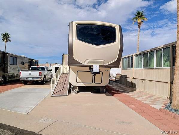 Nice lot in the beautiful Riverview Resort. You own the land. This sale includes a fabulous 5th wheel RV trailer that includes: 2017 Montana Keystone 40', 3 slides, Island kitchen, induction cooktop, full sized refrigerator with ice maker, pantry, fireplace, washer and dryer, 1 1/2 bath, large shower with seating, soaking bathtub, dual vanity, central vacuum, vinyl plank flooring throughout, king size bed, 40 gal hot water tank, surround sound stereo system, loads of storage and so much more. this is a must see. The entire lot is concrete and pavers. A large shed/workshop is the cherry on top. This great set up is located in the desirable Riverview Resort. Located just minutes from the Colorado River and Laughlin Nevada. This is a gated guarded 697 lot community. Amenities include a 9 hole gorgeous golf course, pickleball, tennis, indoor shuffleboard, card room, billiard room, craft room, fully equipped gym with showers and saunas, library, ballroom that hosts dinners, dances, bingo and more. This is a 55+ community. HOA dues are 340.00 per month and include sewer, water, trash and cable TV. What a deal! This is truly an adult playground. *Dog restrictions apply