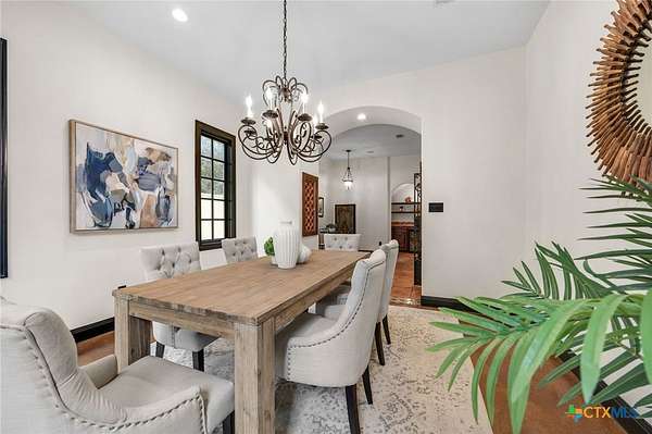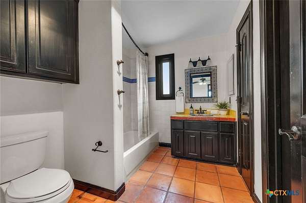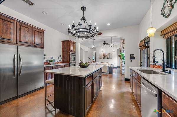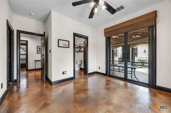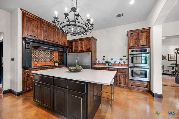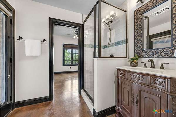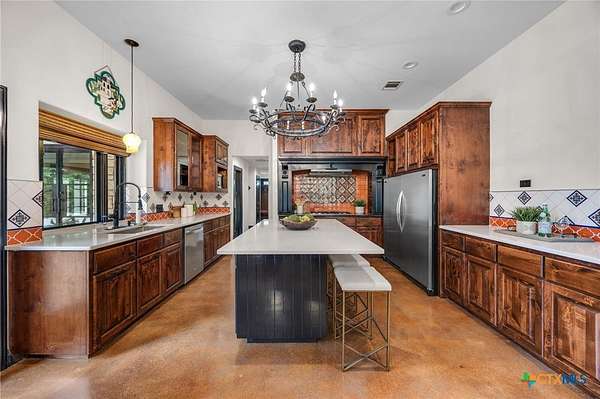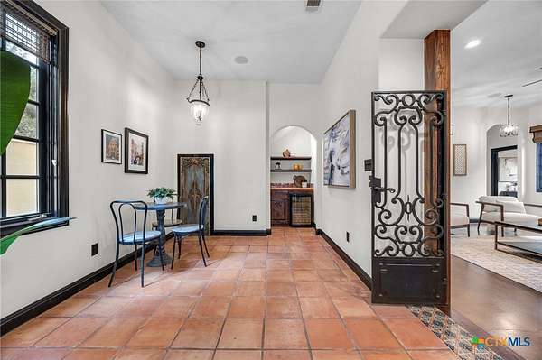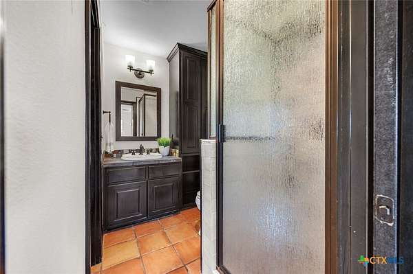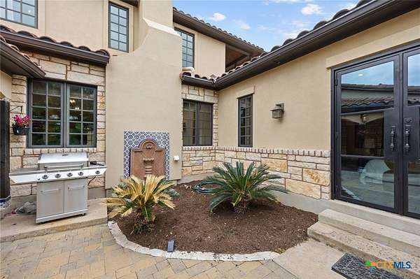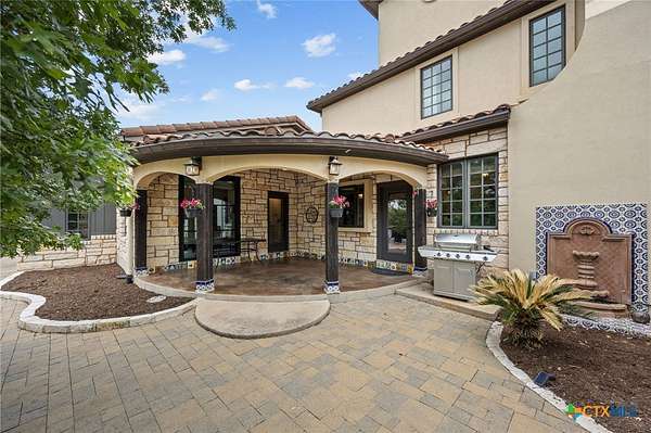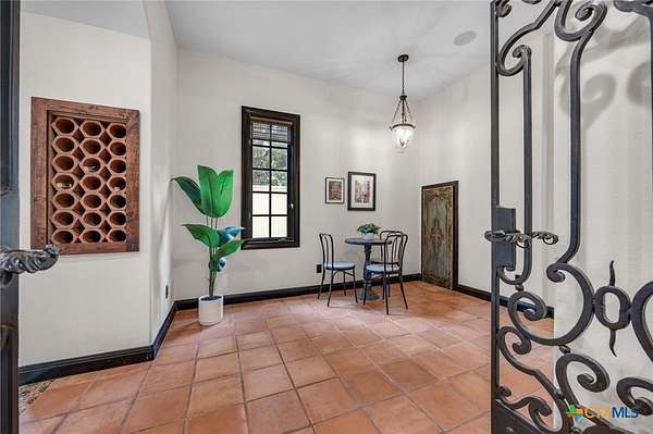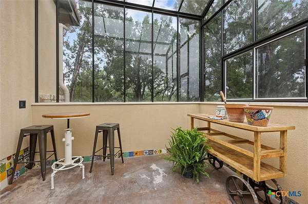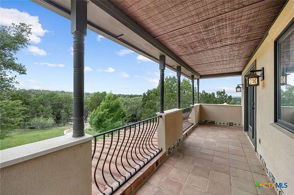 Set on 2.5 secluded acres in the Texas Hill Country, this Spanish villa is genuinely one of a kind. A private gated entrance welcomes you in, leading down a winding drive through mature live oaks before the home comes into view. The red tile roof, limestone and stucco exterior, arched entryways, and wrought iron details give it real character, and the sweeping paver walkway and manicured grounds make you feel right at home from the moment you arrive. The primary bath was recently renovated - freestanding soaking tub, floor-to-ceiling marble tile, herringbone walk-in shower, wood double vanity with backlit mirrors, and a crystal pendant chandelier over the tub. The kitchen feels right at home with dark wood cabinetry, hand-painted Talavera tile, and quartz countertops with a large commercial refrigerator. The attached glass greenhouse is one of those spaces you don't expect to find - cathedral glass panels, treetop views, and endless potential as a sunroom, studio, or plant lover's dream. If you're looking for something with real character, privacy, and acreage in Lago Vista, this is the one!