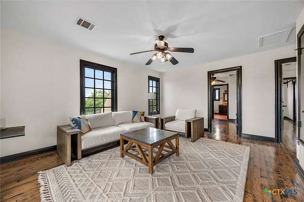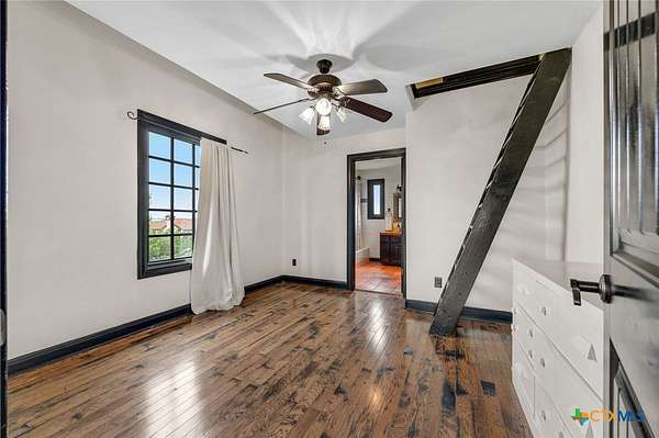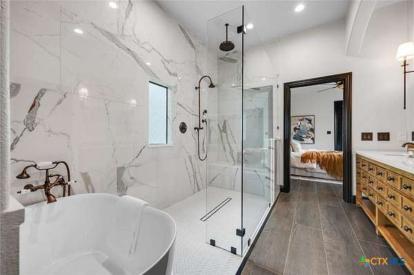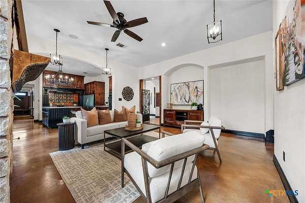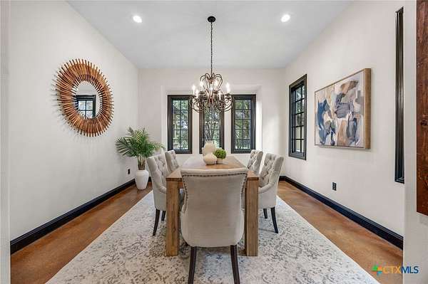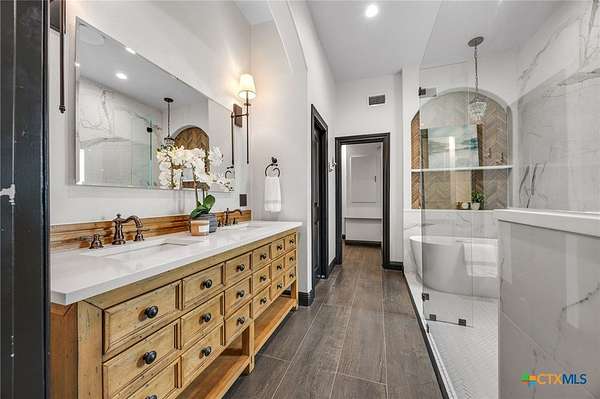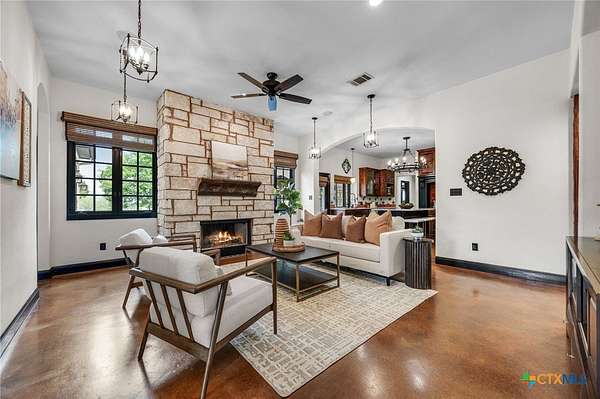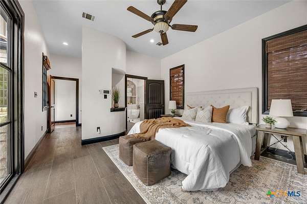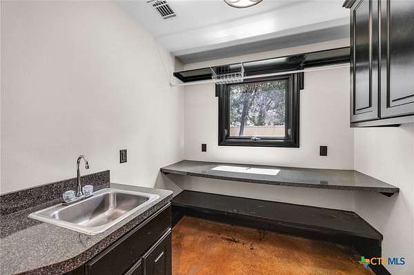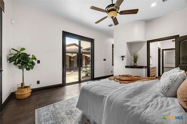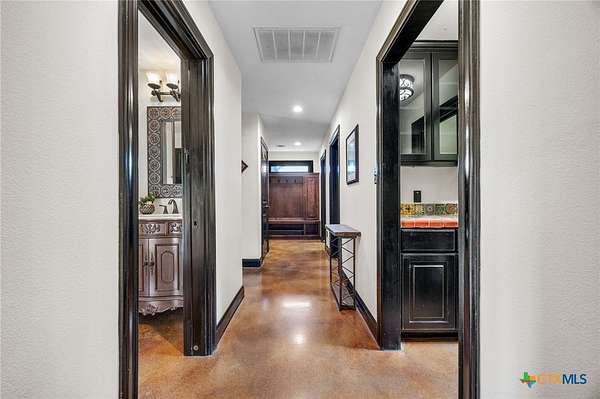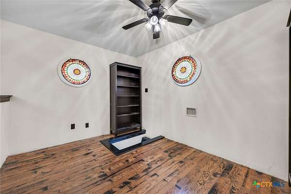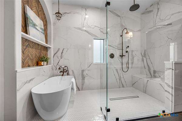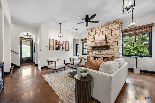 Set on 2.5 secluded acres in the Texas Hill Country, this Spanish villa is genuinely one of a kind. A private gated entrance welcomes you in, leading down a winding drive through mature live oaks before the home comes into view. The red tile roof, limestone and stucco exterior, arched entryways, and wrought iron details give it real character, and the sweeping paver walkway and manicured grounds make you feel right at home from the moment you arrive. The primary bath was recently renovated - freestanding soaking tub, floor-to-ceiling marble tile, herringbone walk-in shower, wood double vanity with backlit mirrors, and a crystal pendant chandelier over the tub. The kitchen feels right at home with dark wood cabinetry, hand-painted Talavera tile, and quartz countertops with a large commercial refrigerator. The attached glass greenhouse is one of those spaces you don't expect to find - cathedral glass panels, treetop views, and endless potential as a sunroom, studio, or plant lover's dream. If you're looking for something with real character, privacy, and acreage in Lago Vista, this is the one!