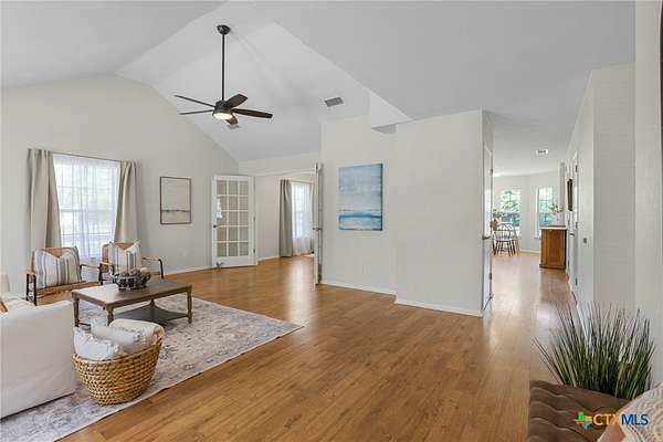 - All Bedrooms Down, Breakfast Area, Ceiling Fans, Eat In Kitchen, Home Office, Kitchen Dining Combo, Main Level Primary, Multiple Closets, Pantry, Primary Downstairs, Tub Shower, Vanity, Vaulted Ceilings, Walk In Closets, Window Treatments