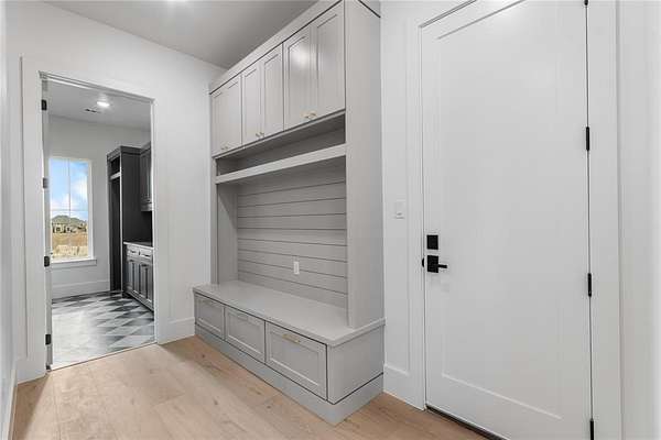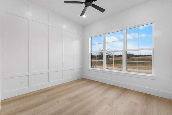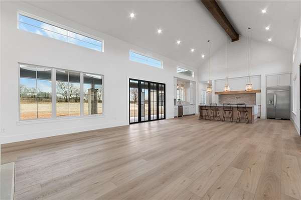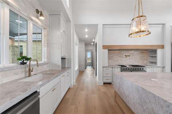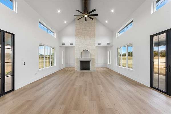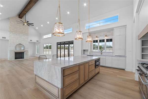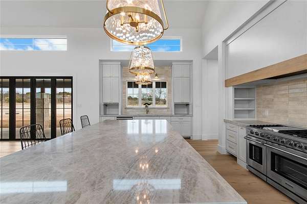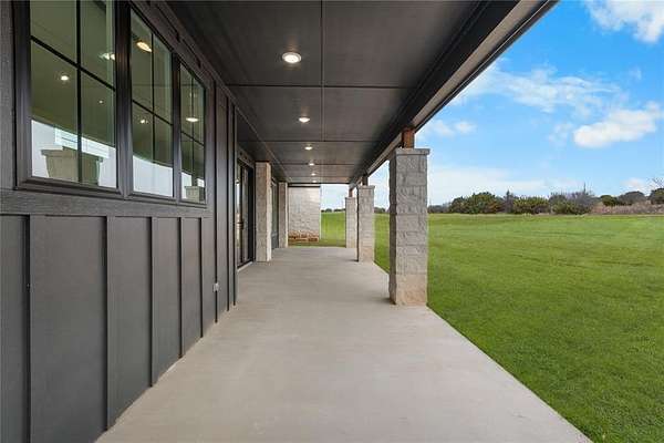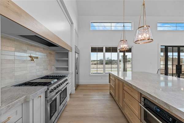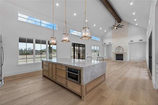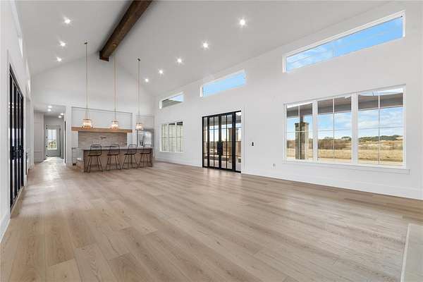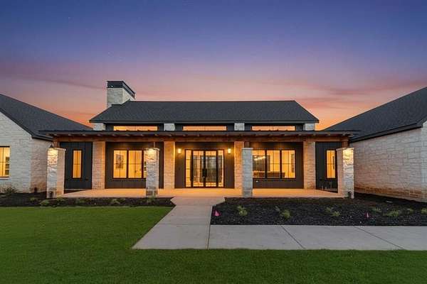 Nestled on a serene 2-acre homesite in the gated community of Terraza Hills, this exceptional new construction by Arteaga Homes showcases meticulous craftsmanship, thoughtful design, and timeless transitional Hill Country style. Perched among tiered hillsides, the property offers sweeping, panoramic views and a peaceful, elevated setting that feels both private and inspiring. The striking exterior reflects the builder's dedication to quality, featuring handcrafted stonework, clean architectural lines, and bold modern black windows and accents that create a refined yet approachable aesthetic. Inside, warm wood tones, custom finishes, and sun-filled spaces create a beautifully layered and inviting atmosphere. The open living area is anchored by a dramatic floor-to-ceiling stone fireplace, walls of windows, and a statement exposed wood beam that highlights the home's artisanal character. The chef-inspired kitchen continues this standard of excellence, offering a gas range with pot filler, abundant custom cabinetry, and a large center island designed for both entertaining and everyday living. The primary suite is a true sanctuary, distinguished by its own exposed wood beam and striking iron sliding barn doors that open to a spa-like bath. The en-suite features double vanities, a freestanding soaking tub, and an oversized walk-in shower with dual shower heads and a rainfall feature--combining luxury with purposeful design. A generously sized back patio extends the home's craftsmanship outdoors, providing a perfect space for dining, gathering, or enjoying quiet evenings and expansive views. Ideally located just seventeen miles south of Fort Worth between Fort Worth and Granbury, this home delivers tranquil hillside living with convenient access to shopping, dining, and city amenities--an extraordinary blend of artistry, quality, and lifestyle in a premier gated community.