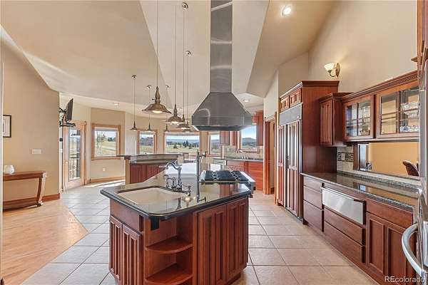 Inside, the 6,900 square foot home features vaulted ceilings, expansive windows, and beautiful custom millwork throughout. The chef’s kitchen is built for entertaining, complete with a massive island, additional gathering space, gas cooktop, and warming drawer.