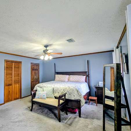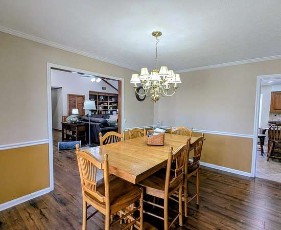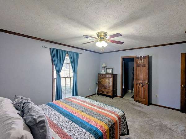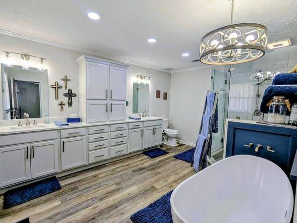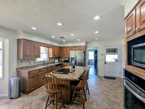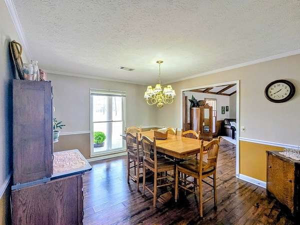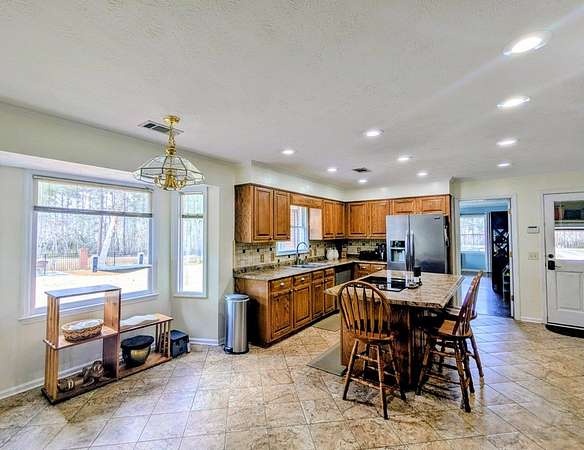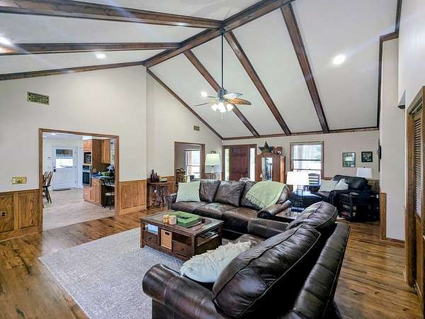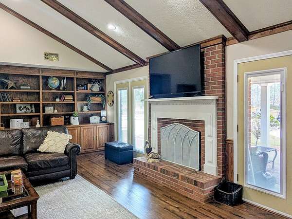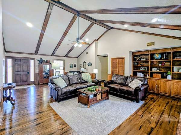2650 sf updated ranch sits at entrance to Rocky Creek on 2.44 acres and no HOA. The rocking chair front porch enters the great room w/wood burning fireplace & built-ins w/beautiful, engineered hardwoods flowing into separate dining room. The eat-in kitchen has island w/cooktop, wall oven, microwave, dishwasher and side-by-side fridge. Beautiful oak cabinetry including built in desk. Laundry room sits off kitchen as well as a bedroom/family room w/half bath & private access to backyard/pool. The opposite end of the home houses the primary bedroom w/dual closets and magnificently updated bathroom with soaker tub, walk in glass shower, dual sinks and plenty of cabinets. Two other nice size bedrooms share a full bath. Step outside the back door to the oasis. Fenced in backyard w/inground pool & covered back patio perfect for entertaining & fun. This home has a 2-car garage, newer water heaters and HVAC. All appliances remain including washer/dryer. Call Mary Whitson now to view this gem.