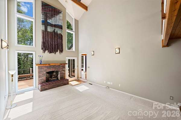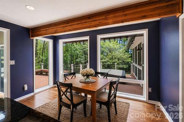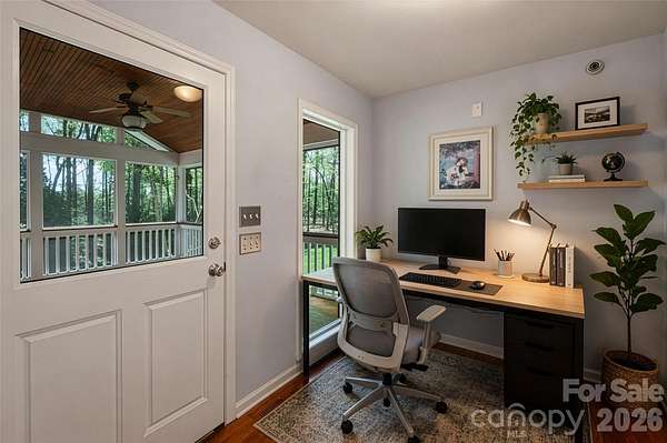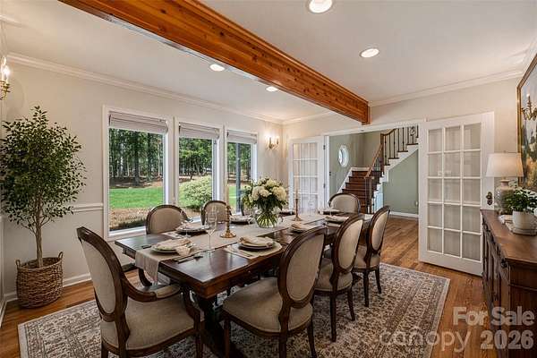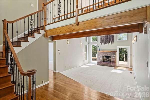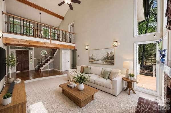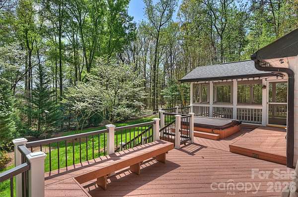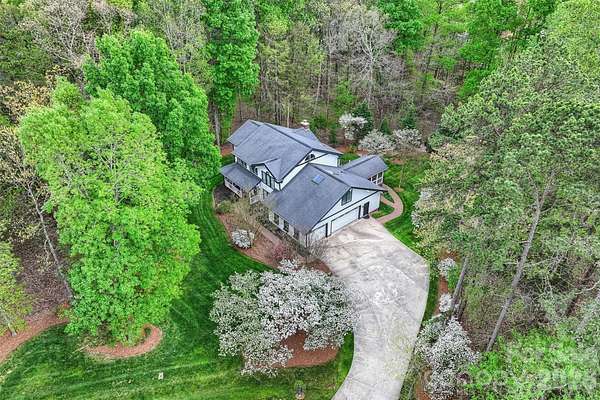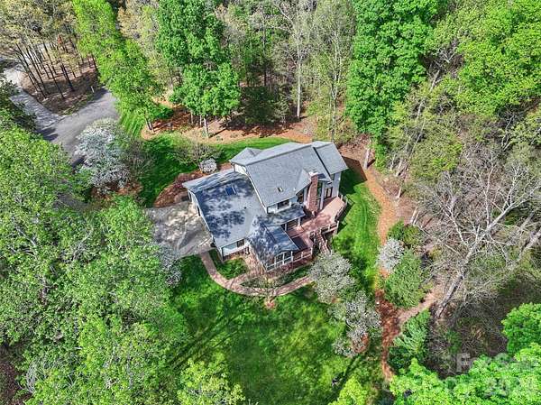 Come home to this traditional two story, three bedroom, three bath, 2,635 square foot residence featuring Craftsman inspired details, classic gables, and a welcoming front porch. Set on a beautifully wooded 2 acre lot in the aptly named Tranquillity neighborhood of Kannapolis, the property offers a peaceful natural backdrop enhanced by thoughtful landscaping and seasonal flowering plants. Inside, a dramatic foyer opens to a stunning vaulted living room with exposed beams, expansive windows overlooking the wooded backyard, and a brick fireplace that anchors the space. Natural light pours in throughout the day, and the room's open flow connects seamlessly to the deck and adjacent living areas. French doors lead to the bright, refined formal dining room, which transitions gracefully into the kitchen and breakfast area. The thoughtfully designed floorplan includes a private main level bedroom ideal for guests or a home office. Upstairs, two additional bedrooms, including a spacious primary suite, are arranged in a desirable split layout for added privacy, accompanied by a generous bonus room with laundry. Outdoor living shines with a large deck and hot tub overlooking the trees, along with a charming screened patio perfect for quiet mornings or relaxed evening gatherings. Practical upgrades include an encapsulated crawl space, a spacious three car garage, and a tankless water heater. Climate control is efficiently managed with gas heating for the main level and upstairs guest bedroom, complemented by a new electric heat pump serving the primary suite and bonus room. The home's location offers a balanced blend of tranquility and convenience, with quick access to I-85 for commuting and nearby shopping, dining, and services along the Kannapolis Highway corridor. The neighborhood provides a quiet, residential feel while keeping you connected to the essentials of modern life.