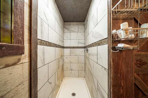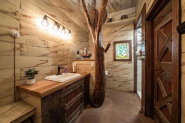 The bathroom building is just feet away. Upon opening the door, you are taken by the large, floor to ceiling bare tree trunk that guards the facilities. This tree is also adorned with internal LED lights that emanate various colors from the natural holes in the wood and is just another whimsical touch to the property. The tree also marks the entrance to the oversized, tile shower. There is also a sleeping loft that is perfect for children.