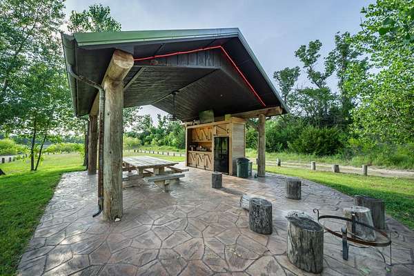 Headed west on the property, you will find a great, open air, covered pavilion near the boat ramp. The pavilion is supported by massive, natural logs that built into the stamped concrete slab. The built-in cabinetry features a refrigerator, which makes an all day picnic easy. This building is great for taking a break from fishing and relaxing in the shade. It just adds to the endless possibilities for this property including family reunions, weddings and other gatherings.