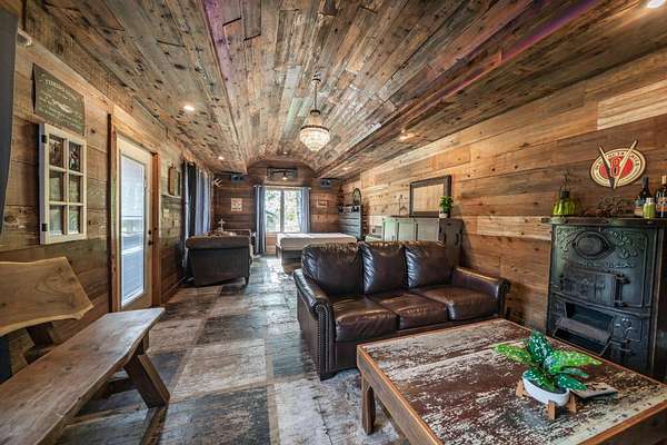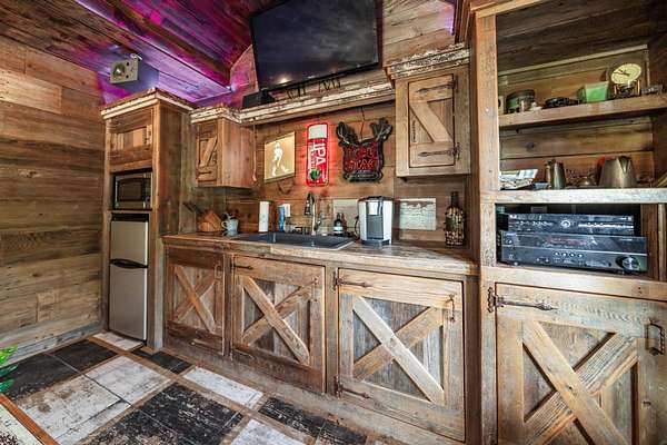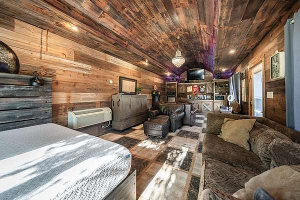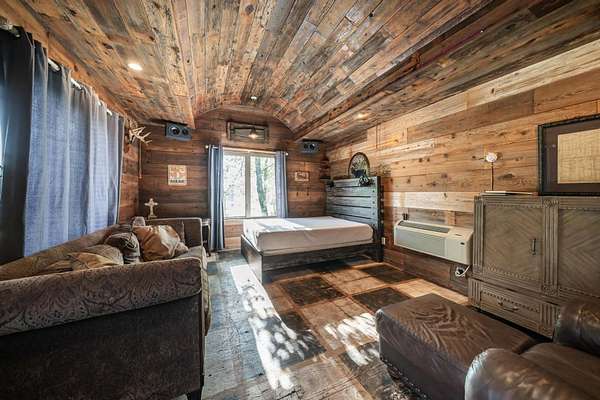 The cabin sits a bit lower on the property and as you enter the building, your eyes are taken by the purposely faded black and white parquet floor and the wooden barrel styled ceiling. The studio design has one bed, a lounge area and a kitchenette. The walls are adorned with reclaimed wood and the cabinetry is made of old barn wood. Complete with oversized leather chairs, the awesome rustic feel is expertly blended with an integrated modern stereo system and color changing LED lights that are woven into the fabric of the building. There is a wonderful fusion of purposeful rustic charm and a modern groove.