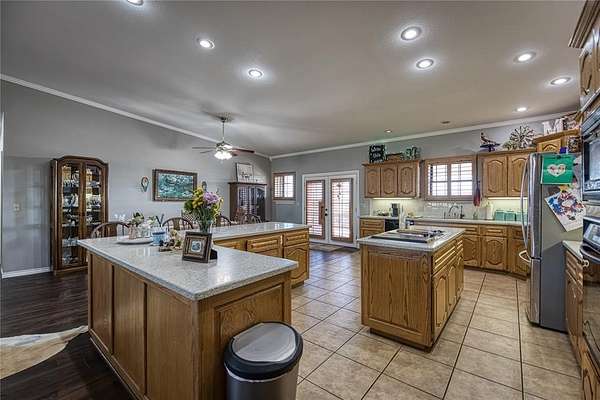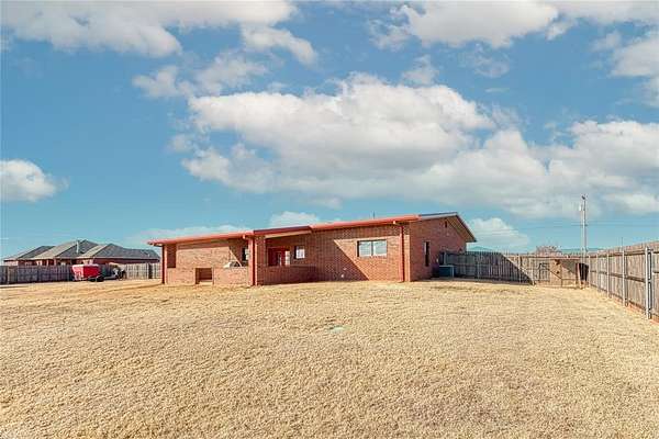 Beautiful 3 bedroom, 2.5 bathroom home on 3.96 acres MOL right in the heart of Elk City! This property offers the perfect blend of space, comfort, and convenience with room to spread out while still being close to town. Step inside to a massive living room featuring beautiful vinyl wood flooring and an open layout that flows seamlessly into the spacious kitchen. The kitchen is designed for both everyday living and entertaining, complete with an island featuring an electric built-in cooktop, recessed lighting underneath the cabinets, solid surface countertops, and abundant cabinet space. The large master suite offers comfort and security with an underground hidden floor safe. The master bath includes a soaking tub, double vanity, huge walk-in shower, separate makeup counter, and generous his and her closets. Two additional bedrooms are connected by a Jack and Jill bathroom featuring a jetted Jacuzzi tub. The sizable utility room includes a mud sink and plenty of cabinet storage. Plantation shutters throughout the home add timeless style and privacy. Outside, you'll find a covered back patio perfect for relaxing or entertaining, a storage shed with electricity and a window unit, and a sliding gate for easy access in and out of the backyard with equipment. The property is complete with a curbed fence, making this acreage both functional and attractive. If you've been looking for acreage, space, and location all in one, this Elk City property checks the boxes!