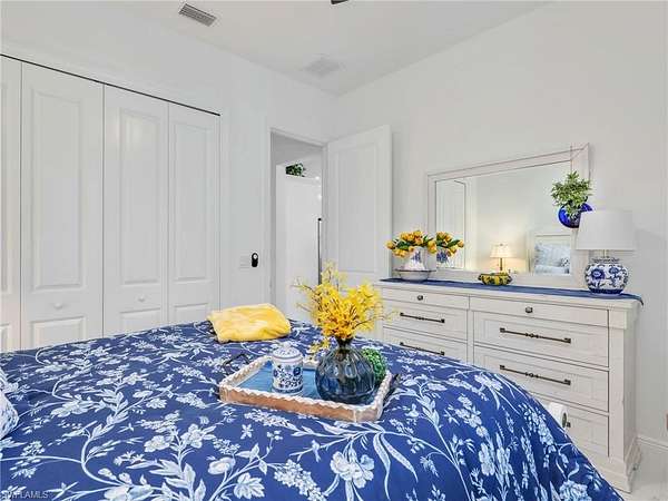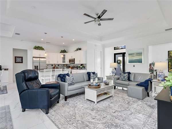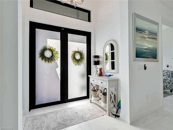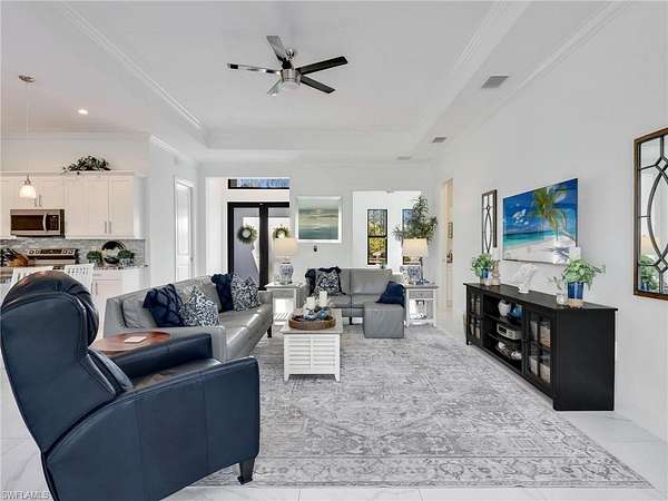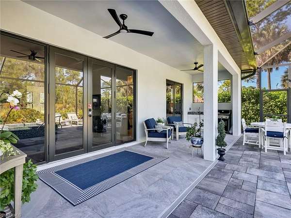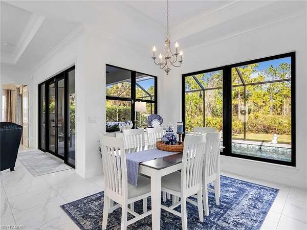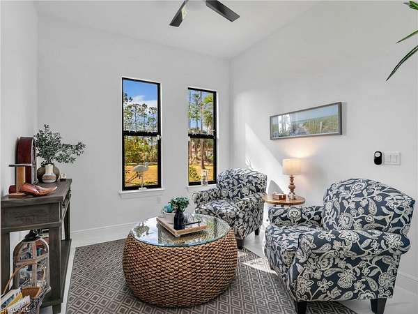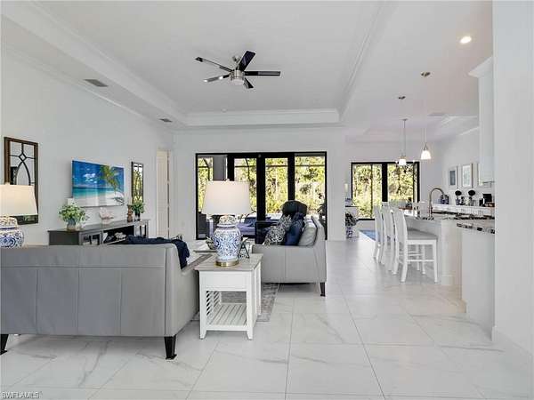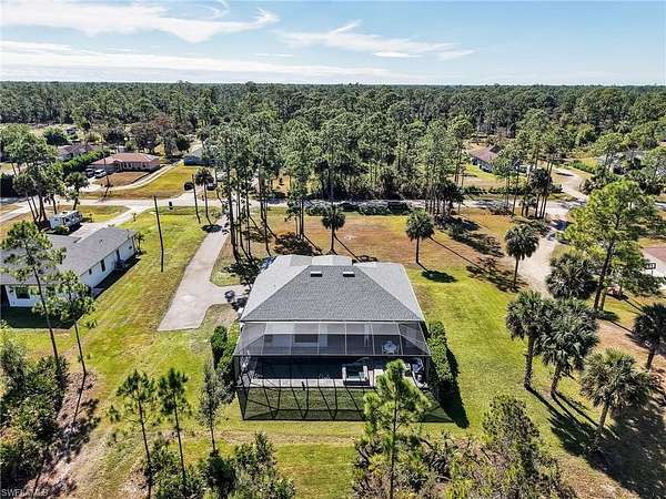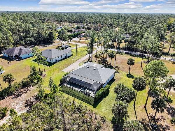 Discover the epitome of modern luxury in this stunning 3 bedroom + den, 2.5 bath, 1900 square foot home with a 2-car side load garage in Golden Gate Estates. With NEGOTIABLE FURNISHINGS and a location that balances secluded acreage with modern convenience, this property represents a RARE opportunity to own a fabulous newer construction pool home in a premier location! Masterfully constructed in 2022, this home is situated on an expansive, oversized 2.73-acre lot. This private retreat with no HOA fees provides a serene view of the surrounding wooded landscape. Designed with elegance and convenience, the residence features WHOLE HOUSE IMPACT RESISTANT WINDOWS AND DOORS, a whole-house reverse osmosis system, & a GENERAC GENERATOR with a 500 gallon propane tank for ultimate peace of mind. Inside, the home features a great room layout defined by 10-ft volume ceilings throughout and exquisite 23x23" marble-look porcelain tile that flows throughout the entire home. The foyer leads into an inviting light filled living area adorned with a 11-ft tray ceiling & additional recessed lighting, creating an atmosphere of sophisticated comfort. The gourmet kitchen boasts white shaker soft-close drawers & doors, sleek quartz countertops, center island with breakfast bar, a double stainless-steel sink with NEW faucet, a glass tile backsplash, and stainless-steel Samsung appliances. The dining area has been upgraded with a NEWLY BUILT-IN BAR that provides extra storage & a neutral quartz countertop. The primary suite is a true sanctuary, featuring its own 11-ft tray ceiling, 2 walk-in closets, and an ensuite bathroom equipped with dual sinks, a glass-enclosed tiled shower & a pocket door leading to the bedroom. All bathrooms offer white shaker cabinetry & quartz counters. French doors open to a versatile den that functions perfectly as a home office or additional sitting area (with room to add a closet if you choose). The laundry room is equipped with a front load Maytag washer and dryer set, upper cabinetry for extra storage, and a cabinet with utility sink. Additionally, there is crown molding in the great room and primary bedroom & ceiling fans in the living room, office, all bedrooms, and lanai. Modern smart home features are integrated throughout, including a Google Home camera doorbell, an ADT-monitored security system, 2 cameras & a Jandy automated light system for pool and spa illumination. The outdoor living space is a masterpiece of Florida lifestyle design, featuring a larger covered lanai with tile flooring and a HEATED SALTWATER POOL & SPA surrounded by upgraded gray pavers & encased in a clear-view screen enclosure. Surrounded by privacy shrubs and equipped with an OUTDOOR WET BAR featuring white shaker cabinetry with a quartz countertop, this area is the ideal setting for al fresco dining and relaxing. Just 2.5 miles to the intersection of Immokalee Rd & Randall Blvd with a Publix, gas stations and other conveniences.