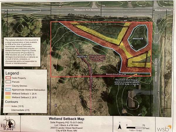 Bring your builder and build your new home on this beautiful country lot. With 2.5 acres and a mix of trees and open land, you will be surrounded by privacy and peaceful country living. Live in the country yet enjoy a short drive to all the amenities that Elk River offers plus easy access to major highways for a easier commute. Best building site is along Meadowvale Road (Image 18) just west of Wetland B or just south of Wetland B if home is smaller. Homes must stay within the yellow and green area. The City of Elk River is willing and open to giving a possible variance for setbacks if necessary. Seller will consider all offers.