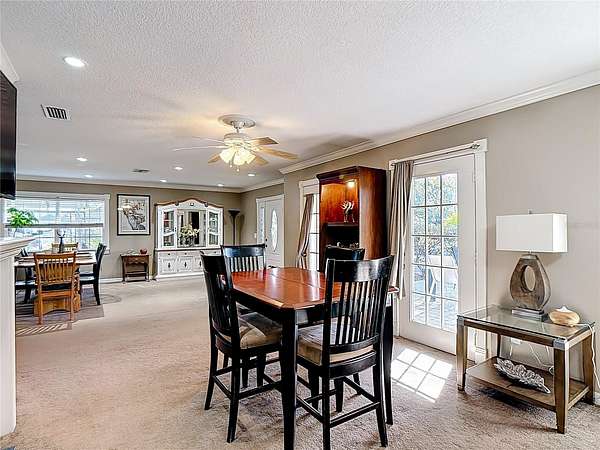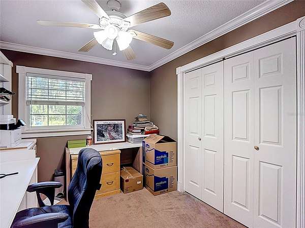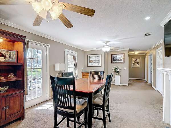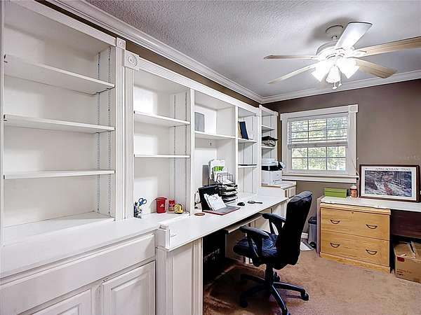 - Built-In Features, Cathedral Ceiling(s), Ceiling Fans(s), Crown Molding, Eat-In Kitchen, Primary Bedroom Main Floor, Solid Surface Counters, Solid Wood Cabinets
