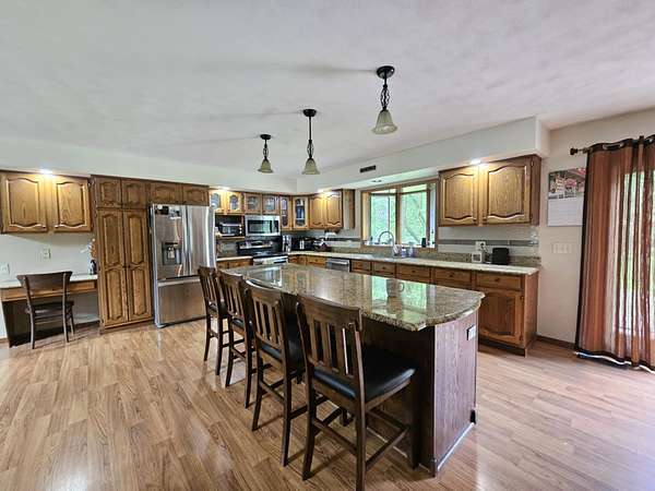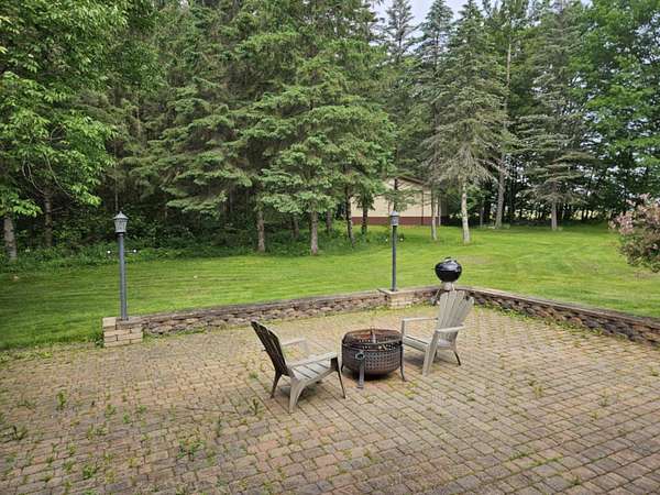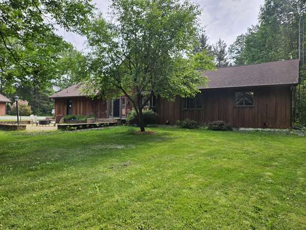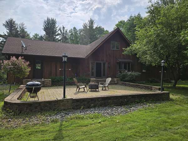 Look who just got a NEW ROOF...this beautiful Chalet Home featuring 5 bdrms 4 baths on 15 wooded acres of tranquility on a paved dead end road. Let's start with the grand room...open concept living with cathedral ceilings compliment the floor to ceiling stone gas fireplace, custom cabinetry hosts granite countertops, tiles backsplash, stainless steel appliances and island seating overlooked by dining. Primary suite with tiled glass shower and double sinks, 2 additional bedrooms, full bath and laundry (with yet another full bath) complete the main floor. Head up to the loft...a great game area or a beautiful reading nook for your own getaway! Need room for entertainment.. check out this amazing lower level...kitchenette, family and rec room all rolled into one...room for all to enjoy family game night! Two additional bedrooms, plenty of storage and a mechanics room wrap it up! What could top all of this...the surroundings of this home...15 wooded acres of nature's color in your backyard. Brick paved patio with firepit for those fall nights of hot cocoa and smores. Looking for a place for the toys...2 car attached garage. 3 car detached insulated garage and a 30X40 metal pole shed should have you covered...take a tour and FALL in love!