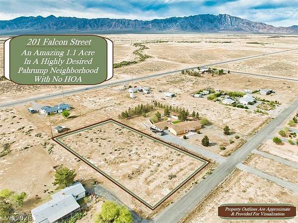 201 Falcon St. Is More Than Your Average Pahrump Acre Property~~~This Prime Parcel Is Located In An Outstanding Neighborhood With Attractive Homes, Fantastic Mountain Views & No HOA~~~This Oversized 1.14 Acre Parcel Is Centrally Located & Less Than 10 Minutes From The Center Of Town~~~This Will Be An Amazing Place For Your Future Pahrump Home With Power Already At The Property Line & Almost 50,000 Square Feet To Plan The House Of Your Dreams~~~The Parcel Is Zoned For Private Well & Septic &, Like Most Pahrump Acre Parcels, Will Require Water Rights To Be Purchased When You Are Ready To Drill Your Well~~~Be Sure To Ask About Lenders That Are Now Offering Land Loans 20% Down & Monthly Payments~~~201 Falcon St. Is A Cut Above The Rest & The Perfect Place For Your Pahrump Plans, Make It Yours Today!