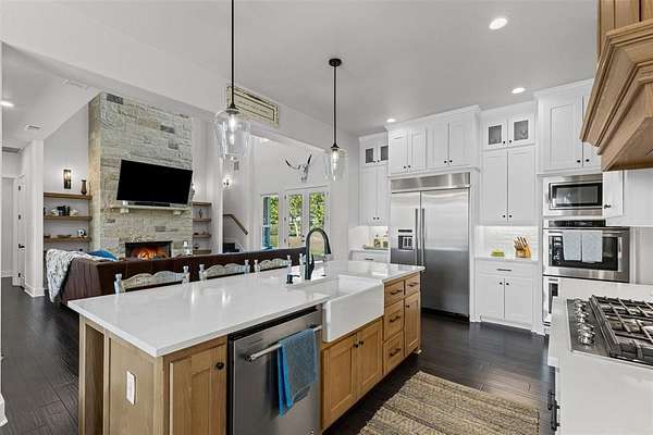 Step into an open-concept main floor defined by a dramatic 20-foot stone fireplace that anchors the great room and creates an impressive focal point for family life and entertaining. The chef's kitchen boasts a large quartz island, custom built-in refrigerator, double ovens, gas range, walk-in pantry and a butler's pantry--offering both style and serious functionality. The main-floor primary suite is a private retreat with two spacious walk-in closets, a generous walk-in shower and a separate soaking tub with a view. A flexible room and convenient laundry complete the main level.