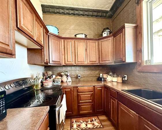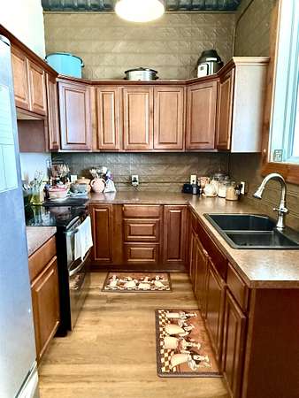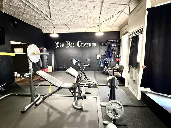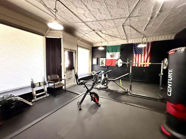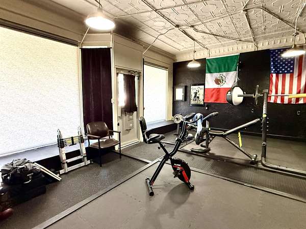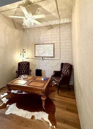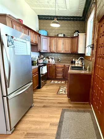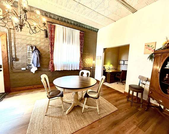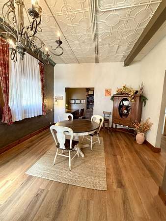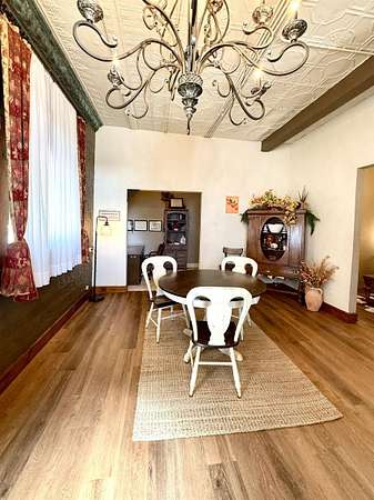 Don't miss out on this charming historic building located on the busiest corner of Hooker's main street business district which offers a unique opportunity to have home + business space all under one roof! The building in total is 1,492 SQ FT with approximately 1/3 of the front area being used as business space and 2/3 of the rear area updated living space. The living area has 2 non-conforming bedrooms, a den/office, full kitchen/dining area, spacious bathroom, utility room with closet & storage space, and back covered patio with two gated access areas and metal fencing. There is a detached storage building and carport which connects to an adjoining lot with RV pad and electric hookups. The front area has recently been updated into a gym environment and the back area has new flooring, beautiful wood doors and more. This charming mixed use historic building maintains beautiful high tin ceilings and cozy feel right in the heart of Hooker.
