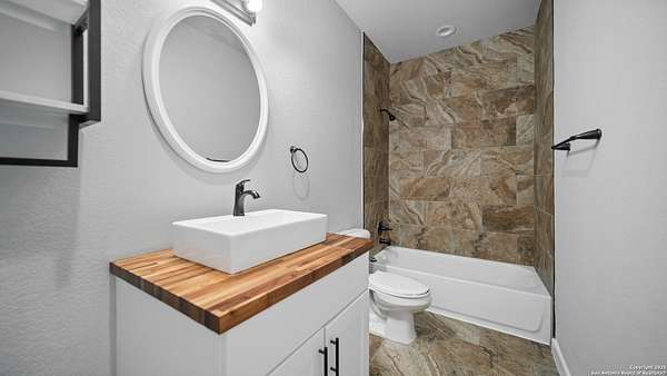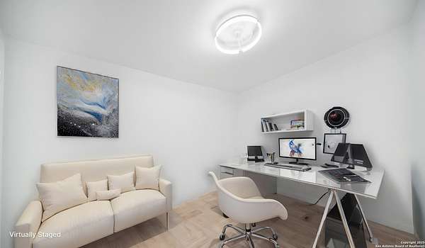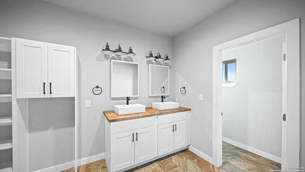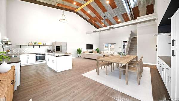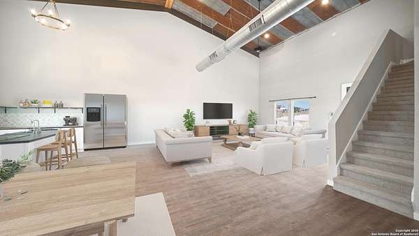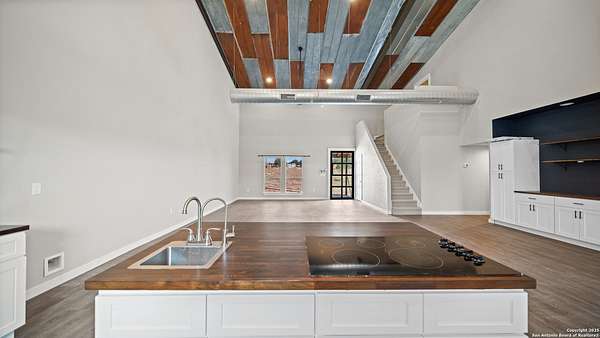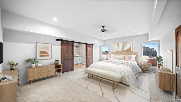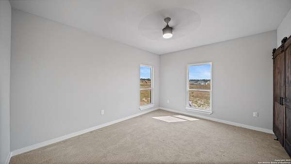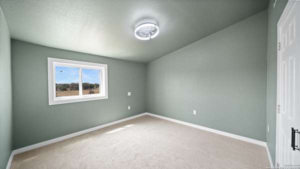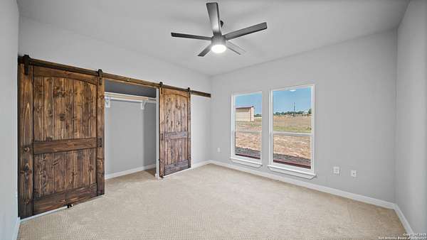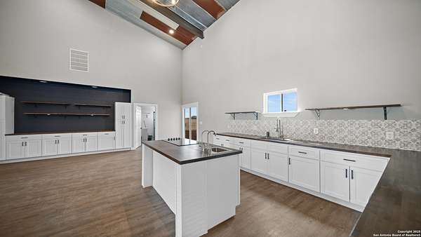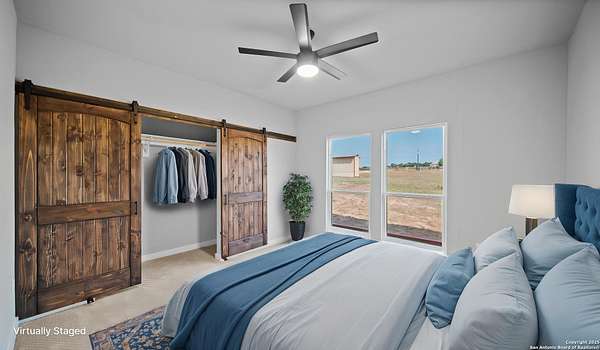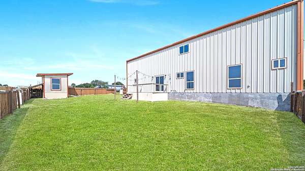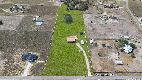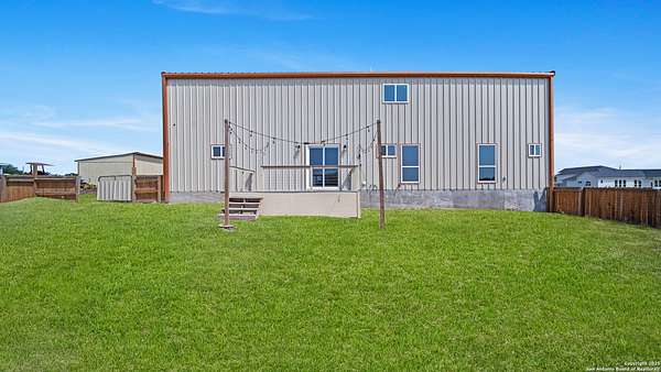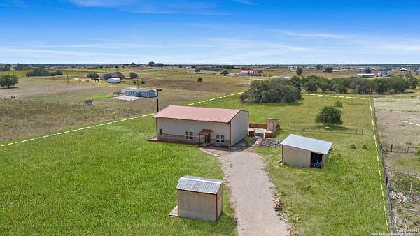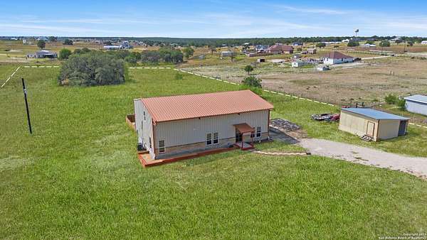 Discover the charm of the countryside with this expansive and contemporary barndominium situated on five acres within the highly desirable Lake Valley Estates subdivision and served by the equally sought out La Vernia Independent School District. This remarkable residence features one of the most substantial living spaces in the area, encompassing nearly 3,600 square feet. It offers seven bedrooms and three full bathrooms, with the versatility of two upstairs rooms that can also serve as a home office and an inviting media room. Uniquely, this property in La Vernia is equipped with its own well, a reverse osmosis water purification system, and a septic system. Upon entering through the custom iron front door, you are welcomed by soaring 22-foot ceilings in the great room. The open floor plan provides an abundance of space for entertaining, making it ideal for large gatherings, and includes a coffee bar with generous cabinet storage. The kitchen features custom cabinetry complemented by butcher block countertops throughout. The spacious primary bedroom boasts a custom ceiling with recessed lighting and adjoins via two great sliding barn doors a palatial bathroom complete with a vaulted walk-in rain shower and a separate tub, offering a serene retreat. The first floor comprises three bedrooms and two full bathrooms, while the second floor includes one full bathroom and four additional rooms, two of which can be adapted as an office and an entertainment space such as a media, pool, or playroom, offering numerous possibilities. The property also features a rear deck within a fully fenced inner backyard and a partially fenced outer border, perfect for enjoying the tranquility of the countryside and stargazing. A significant grove of oak trees on the property presents various opportunities, such as a treehouse or a picnic area. For those with a passion for gardening, a designated planting bed is available. Furthermore, the property offers ample storage space for equipment with three separate sheds, all monitored by a security camera system. This exceptional property, with its substantial lot and living area, presents a wealth of potential for its future owner. We encourage you to schedule a visit to experience it firsthand.