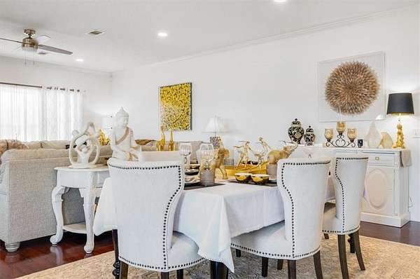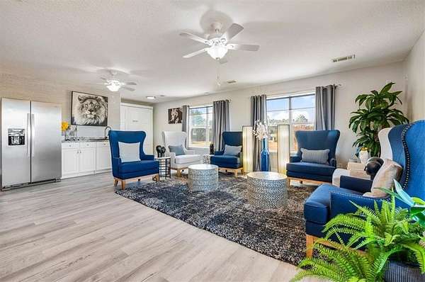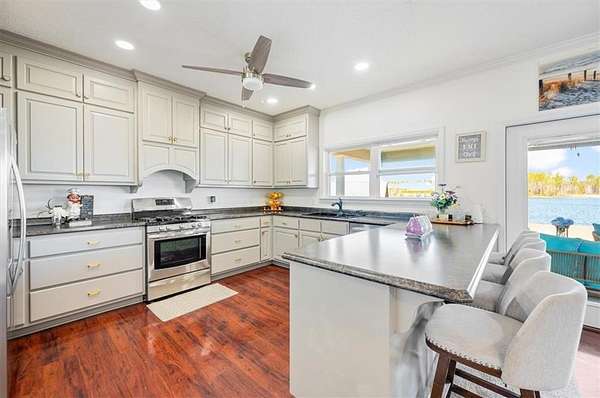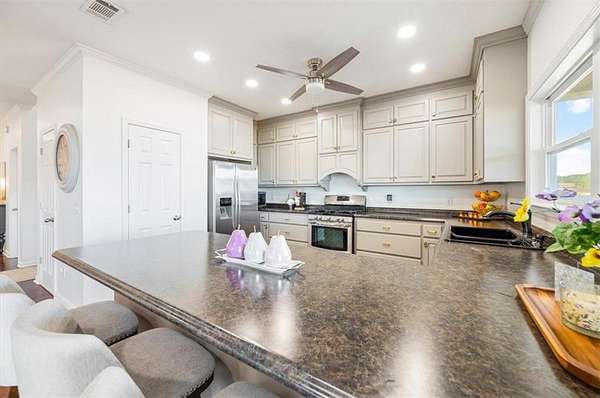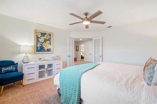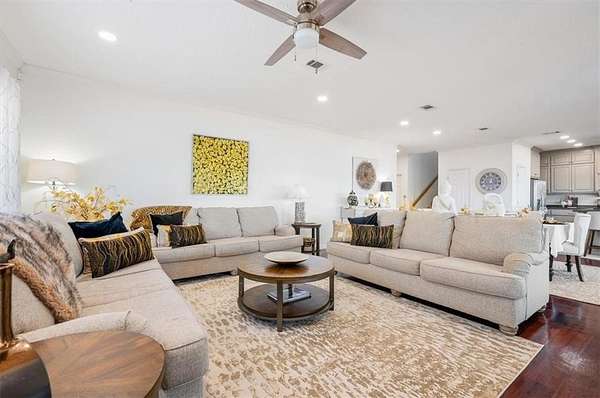 Inside, the open floor plan invites you into a newly remodeled kitchen with updated cabinetry, a gas stove, two pantries, and a breakfast bar that opens to the dining area. French doors just off the kitchen and dining space lead to a spacious patio--perfect for grilling, entertaining, or relaxing outdoors. Recessed lighting and modern ceiling fans have been added throughout for a fresh and functional feel. Downstairs also includes a flexible bedroom or office space and a full bathroom with a walk-in shower.