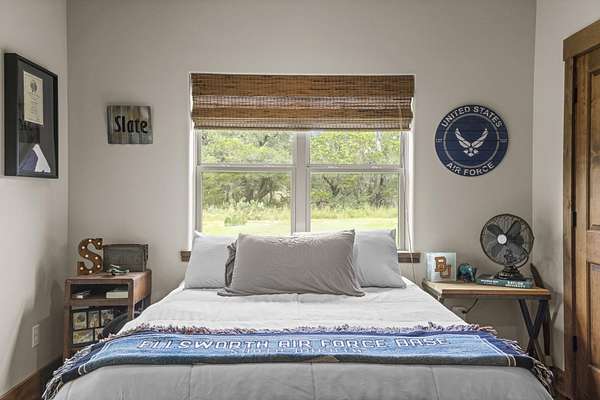 From Hwy 281 and Hwy 29 in Burnet: South on Hwy 281 for 2.2 miles, right on Delaware Springs Blvd for 0.4 mile, continue on Oak Vista for 1.2 miles, right on N Oak Vista Drive for 0.3 mile, house on left.
