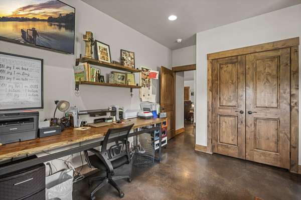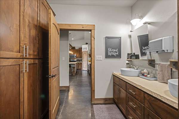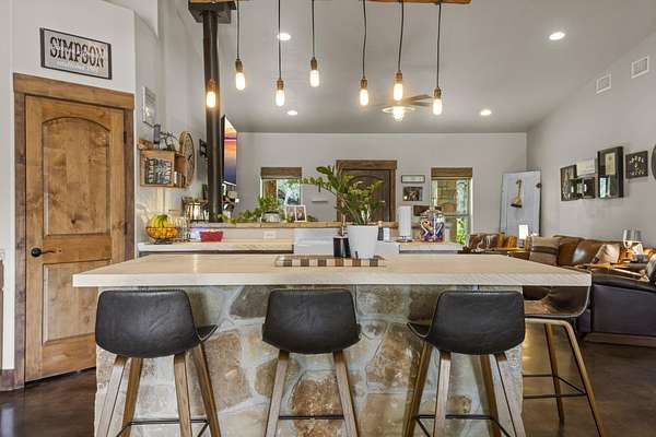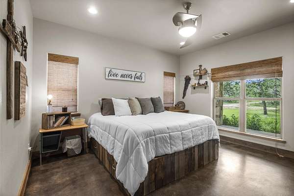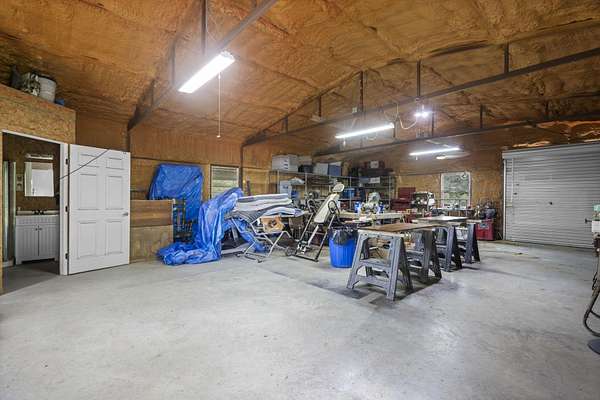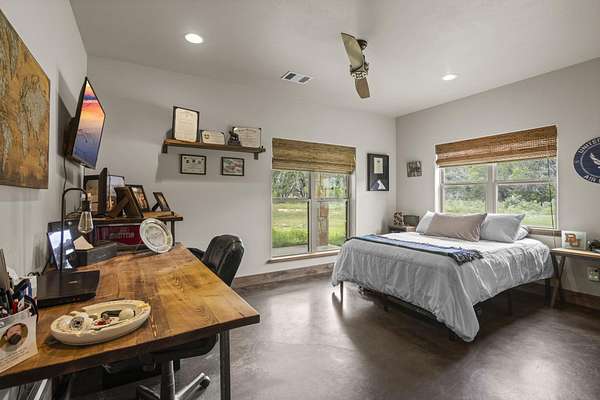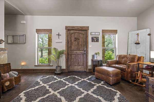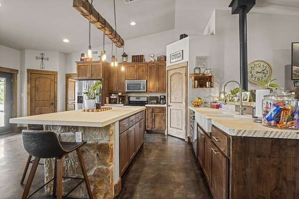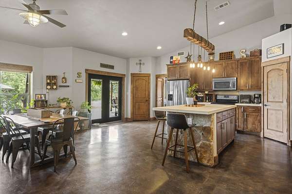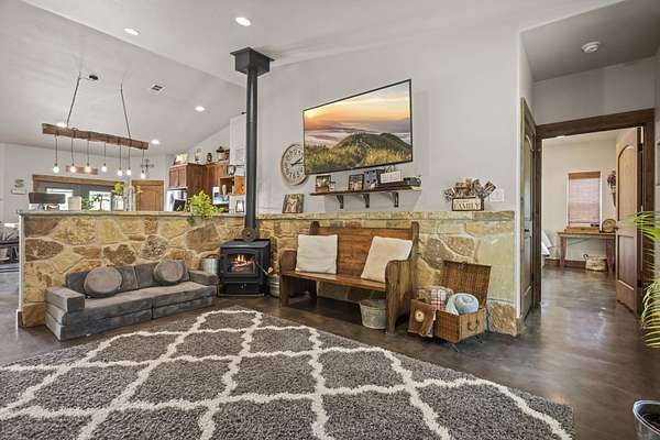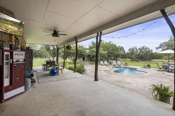 PRICE IMPROVED! Set on 4 peaceful, oak-covered acres, this custom sandstone ranch offers a rare blend of privacy, craftsmanship, and comfort. Designed with both durability and style in mind, the home features an open-concept layout, concrete flooring throughout, and a wood-burning stove that adds warmth and character to the living space. Outdoor living is a true highlight. Wide covered porches provide the perfect setting for quiet mornings or relaxed evenings, while the in-ground pool offers a refreshing retreat during warmer months. The property is fully fenced with an automatic gated entrance, creating a sense of security and seclusion that's increasingly hard to find. Significant updates and infrastructure add long-term value, including a new metal roof, sprinkler system, and a high-producing water well delivering approximately 75 gallons per minute. For added flexibility, the 1,200-square-foot shop-complete with a full bathroom-offers excellent space for hobbies, storage, or a home-based workspace. Recently reintroduced to the market at a new price, this property presents an exceptional opportunity for buyers seeking space, privacy, and quality finishes, all within reach of everyday conveniences.